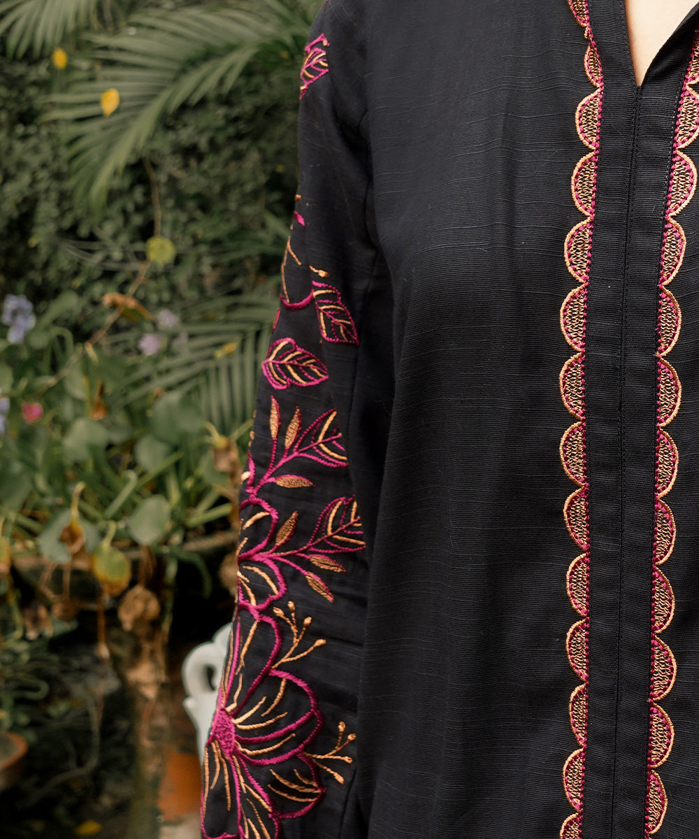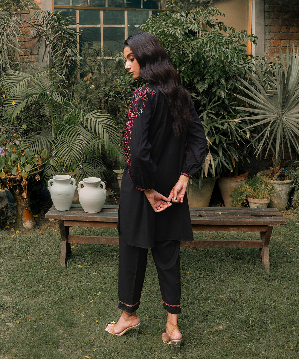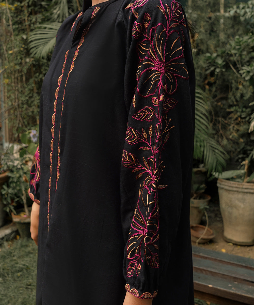 Description: A chic two-piece suit in black Khaddar featuring elegant embroidery on the sleeves and front, paired with stylish harem pants for a trendy, comfortable look.