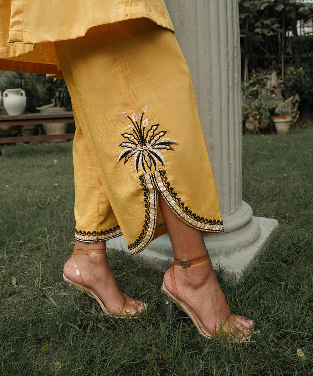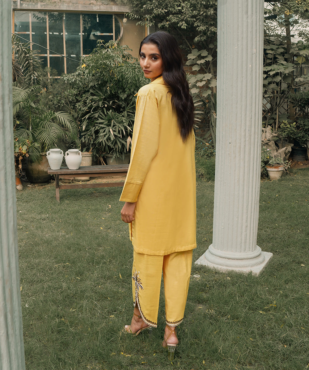 Description: A bright lime yellow Khaddar two-piece suit featuring a shirt with stylish pleat detailing and trousers adorned with delicate embroidery. This ensemble blends modern design with traditional elegance, ideal for a chic and cozy look.