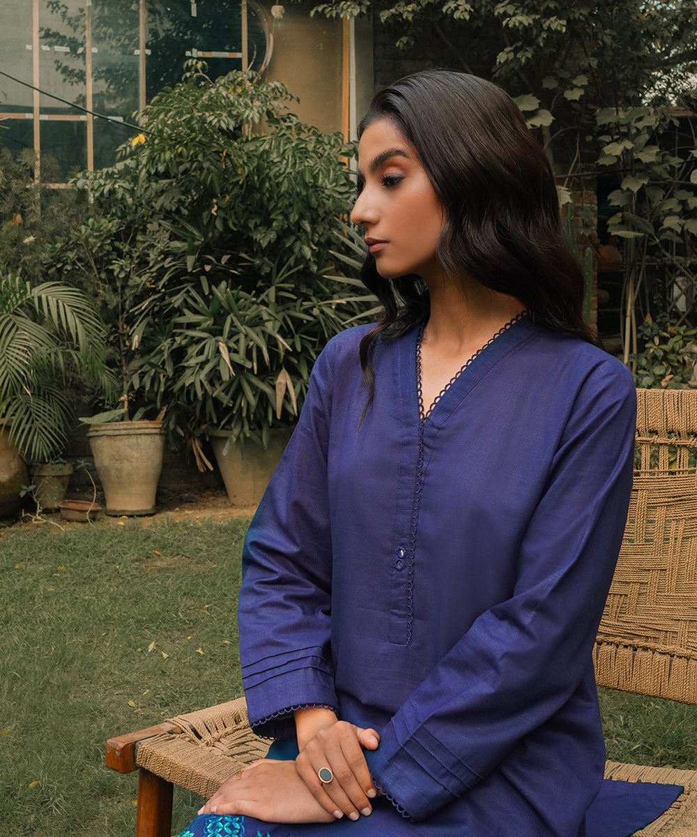 Description: This two-piece Khaddar suit in a solid blue base is adorned with delicate lace and sheesha button details on the neckline and sleeves, complemented by embroidered hem. The trousers feature refined stitching details, making it a perfect blend of elegance and comfort for cooler days.