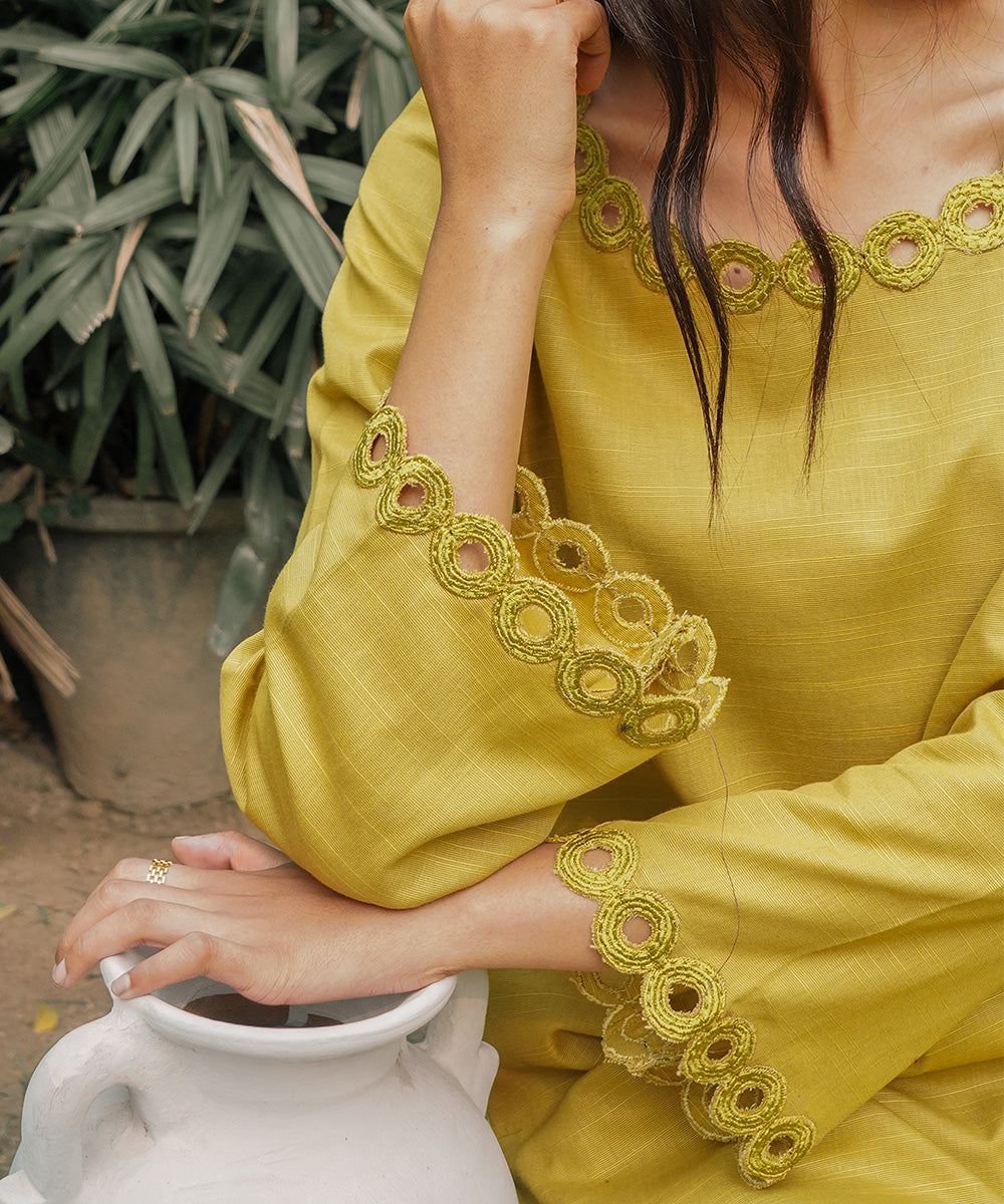 Description: A vibrant apple green Khaddar two-piece suit featuring elegant embroidery on both the shirt and straight pants. This solid, cozy outfit combines style and comfort, perfect for a refined yet relaxed look in cooler weather.