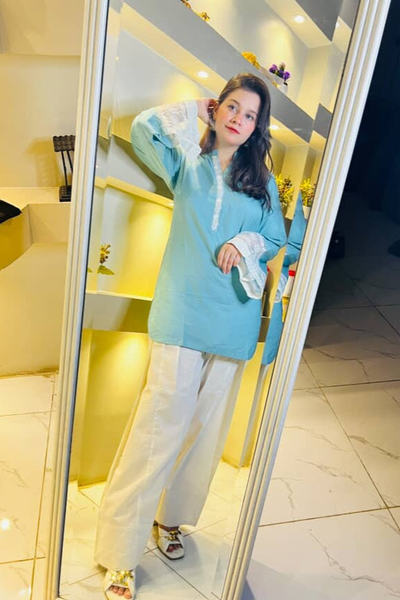 Elevate your festive style with our ivory aari embroidery in extra soft mint green- two piece ensemble with a ivory salwar.