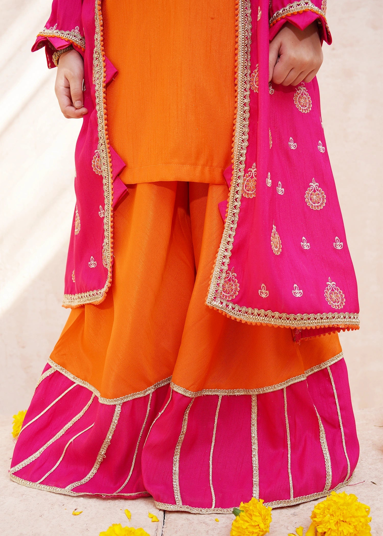 Bottom: Orange rawsilk gharara with embroidery and lace