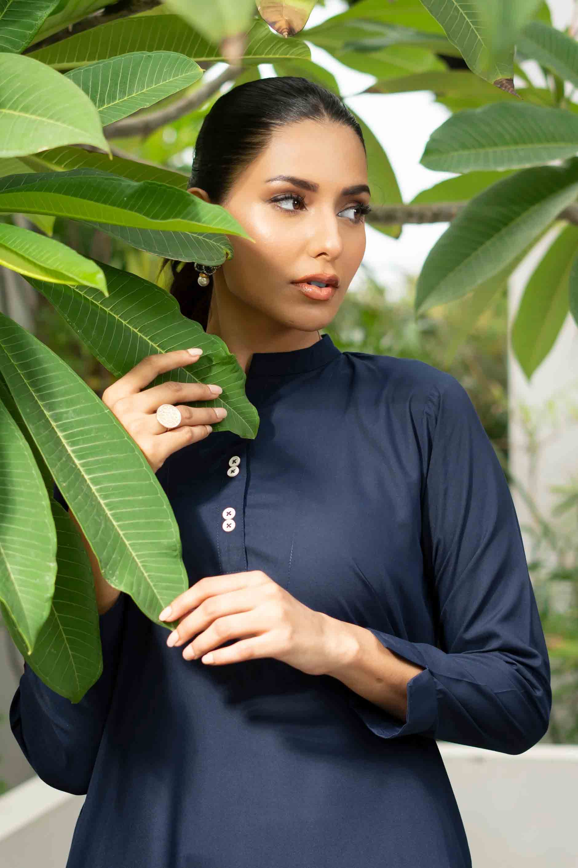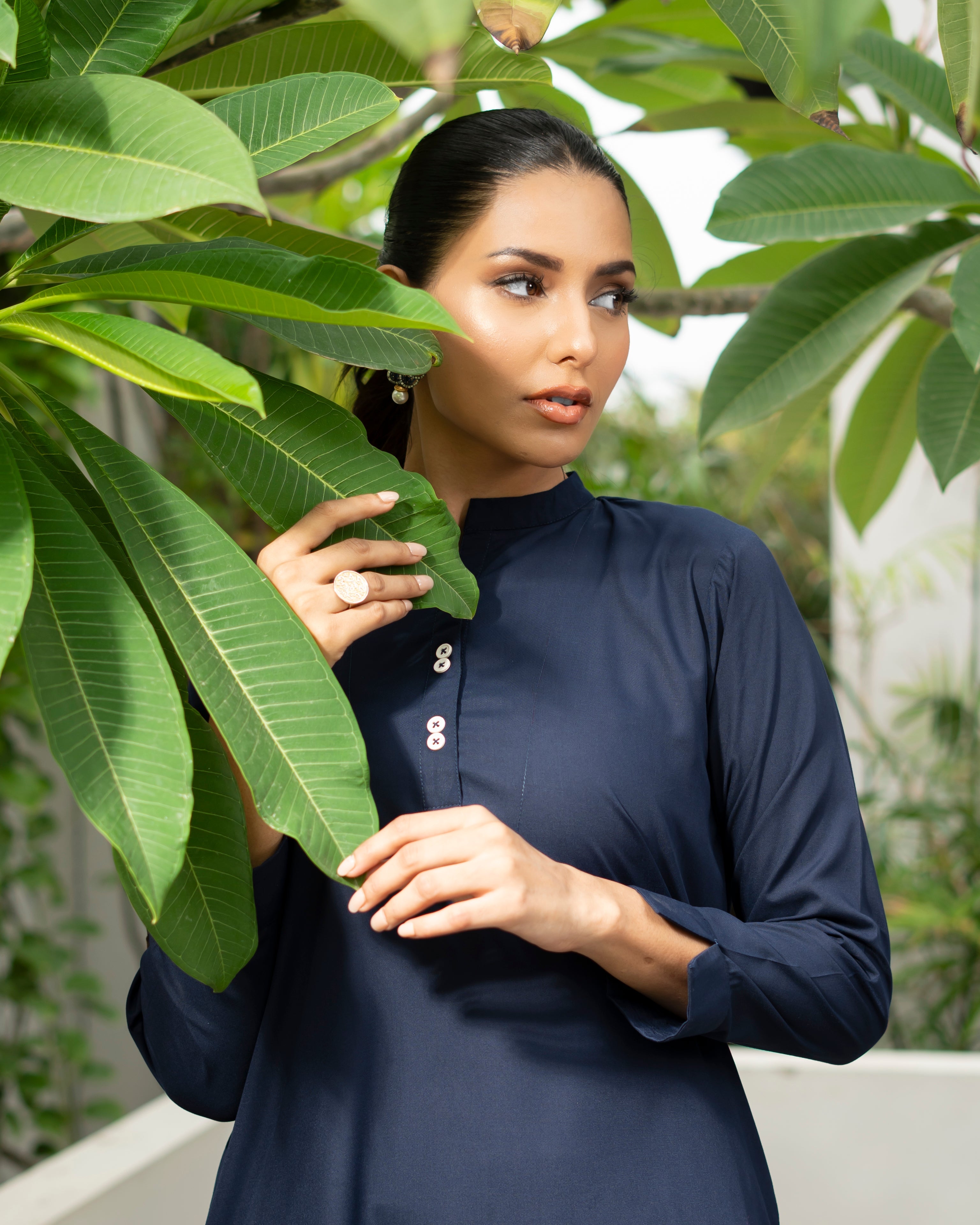 Aitbaar is a timeless two-piece in navy blue, crafted to evoke the essence of trust and confidence. The flowing silhouette and clean lines create a sense of effortless elegance, perfect for making a statement at any occasion. Pair it with poise and own your inner strength!