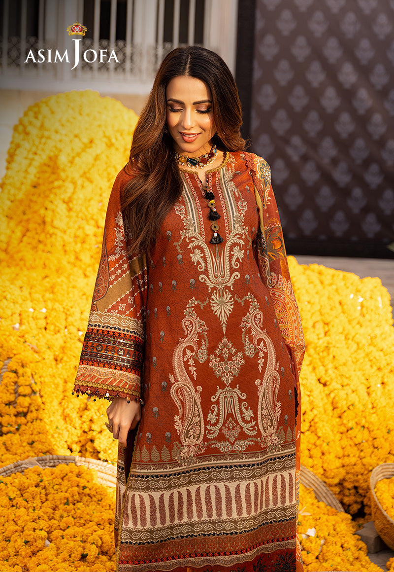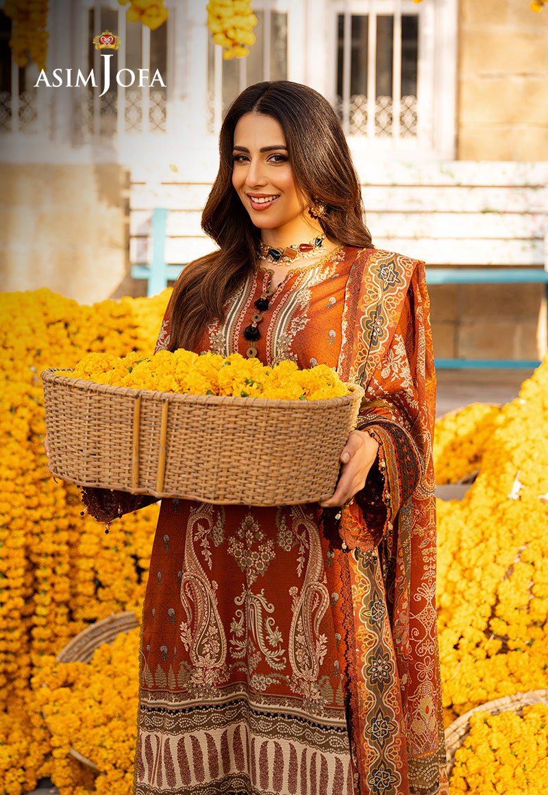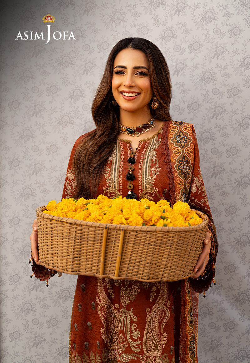 In the tapestry of style, this rust ensemble from Asim Jofa's "Aira – Summer Print Collection" emerges as a masterpiece of sophistication. The embroidered sleeves and daman borders weave a story of intricate craftsmanship while the digital printed shirt and dupatta paint a picture of tradition and charm. Like a melody that lingers in the air, this outfit is donned by Ushna Shah and captures the essence of timeless beauty inviting you to immerse yourself in its harmonious blend of colors and motifs where each thread whispers tales of elegance and grace.