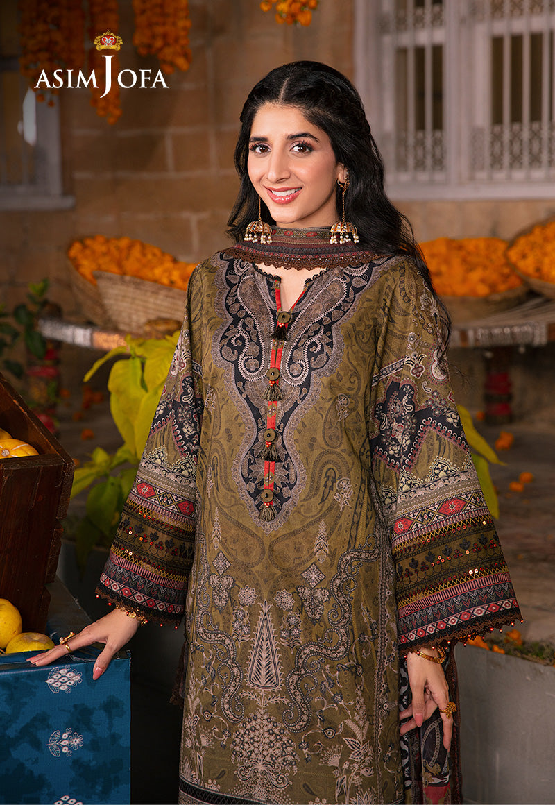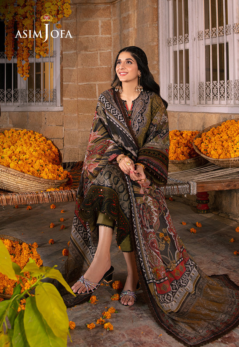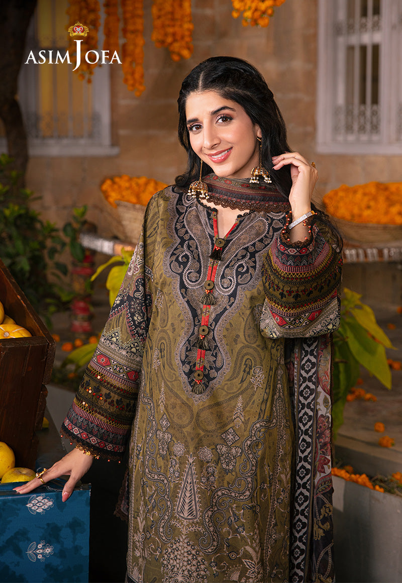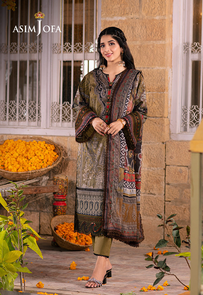 Wrap yourself in the epitome of sophistication with our "Aira - Summer Printed Collection" ensemble. This olive outfit boasts exquisite embroidery along the daaman and sleeves borders where sequins delicately catch the light adding a touch of luxury to your attire. The digital printed shirt is adorned with captivating contemporary motifs infusing your look with modern elegance. Draped in a luscious digital printed butter silk dupatta featuring floral motifs, you'll embody the essence of refined style and grace. Experience the allure of Asim Jofa's craftsmanship as you step into a world of timeless beauty.