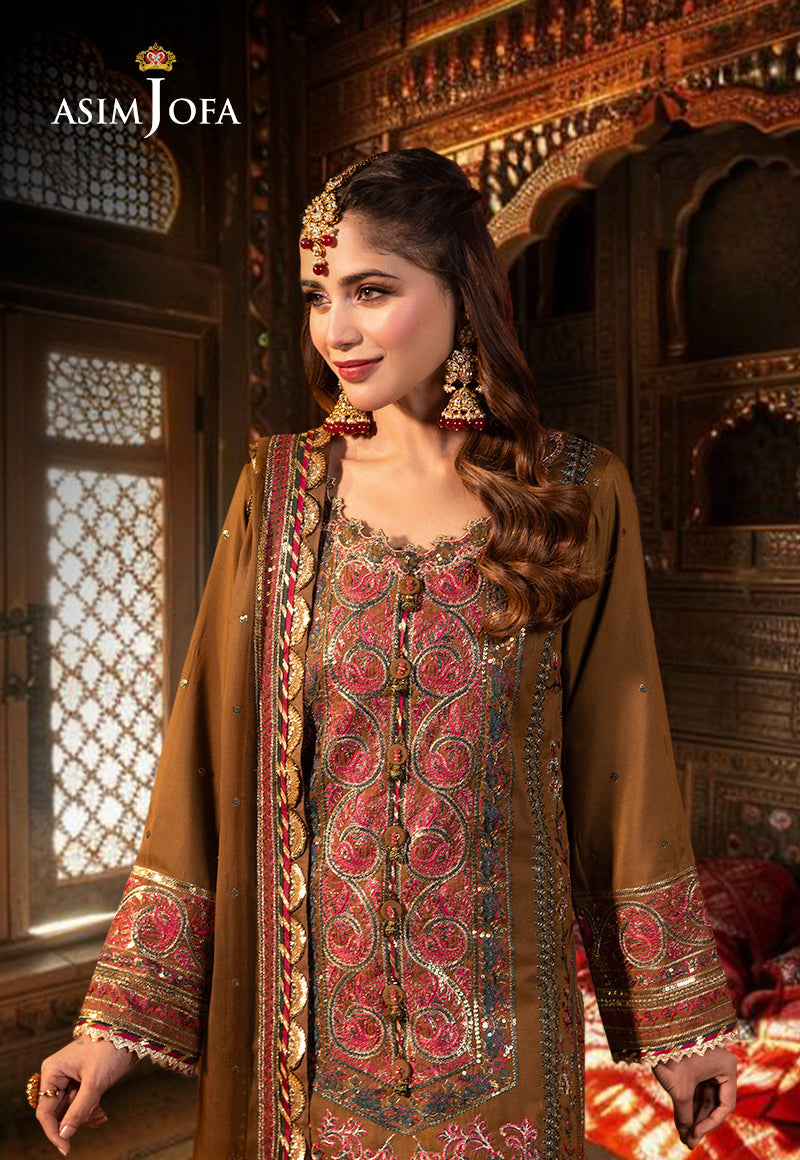 Like a gilded tapestry woven with threads of dreams and desires, this dark gold ensemble by Asim Jofa beckons you into a world of timeless elegance. The light gold cupped sequins and intricate gold zariwork sparkle casting a luminous glow upon the fabric. Hot pink and teal green threadwork intertwine creating a kaleidoscope of color and charm that dances across the shirt. Acanthus motifs, ancient symbols of beauty and grace adorn the embroidery whispering tales of tradition and heritage. With embroidered panels, borders, sleeves, and chaak, this ensemble is a testament to the beauty of craftsmanship and artistry. Draped with an embroidered dupatta, it is a vision of majesty and splendor inviting you to embrace your inner queen and shine with unparalleled grace.