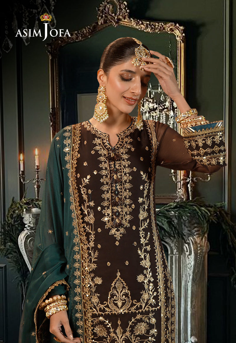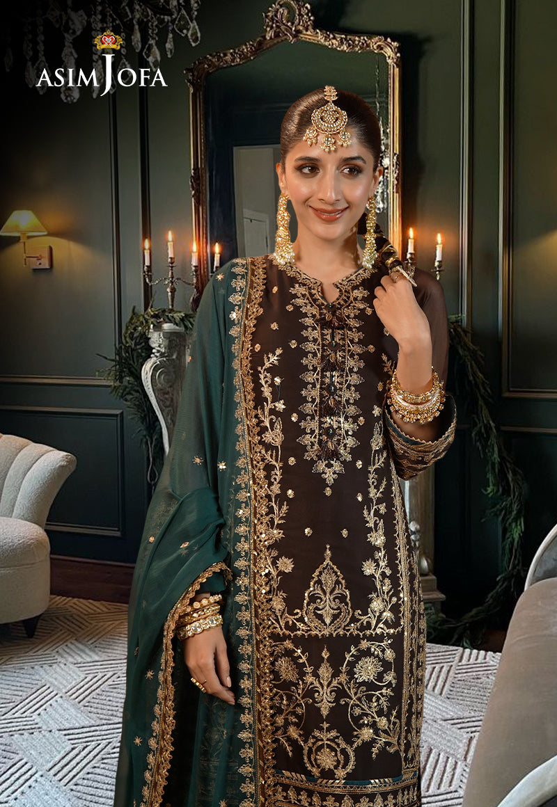 Discover elegance personified with this dark brown embroidered ensemble from “Chamak Damak” collection which is a masterpiece of refined allure and charm. Drenched in the richness of dark brown hues embellished with radiant gold zari and exquisite cupped sequins, this ensemble is a symphony of luxury and style. The elaborate traditional and floral embroidery adorning every inch of the shirt speaks of craftsmanship and heritage. Paired with a teal dupatta, it's a statement of sophistication and grace designed for those who revel in the beauty of tradition.