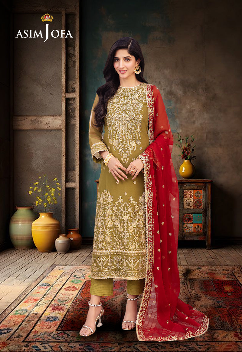 This design is an ode to the springtime with its fresh green color etched in gold zari, sequins & beige thread worked heavily together. The vibrant rust colored embellished chiffon dupatta adds a brilliant contrast making this design a must have for this season.