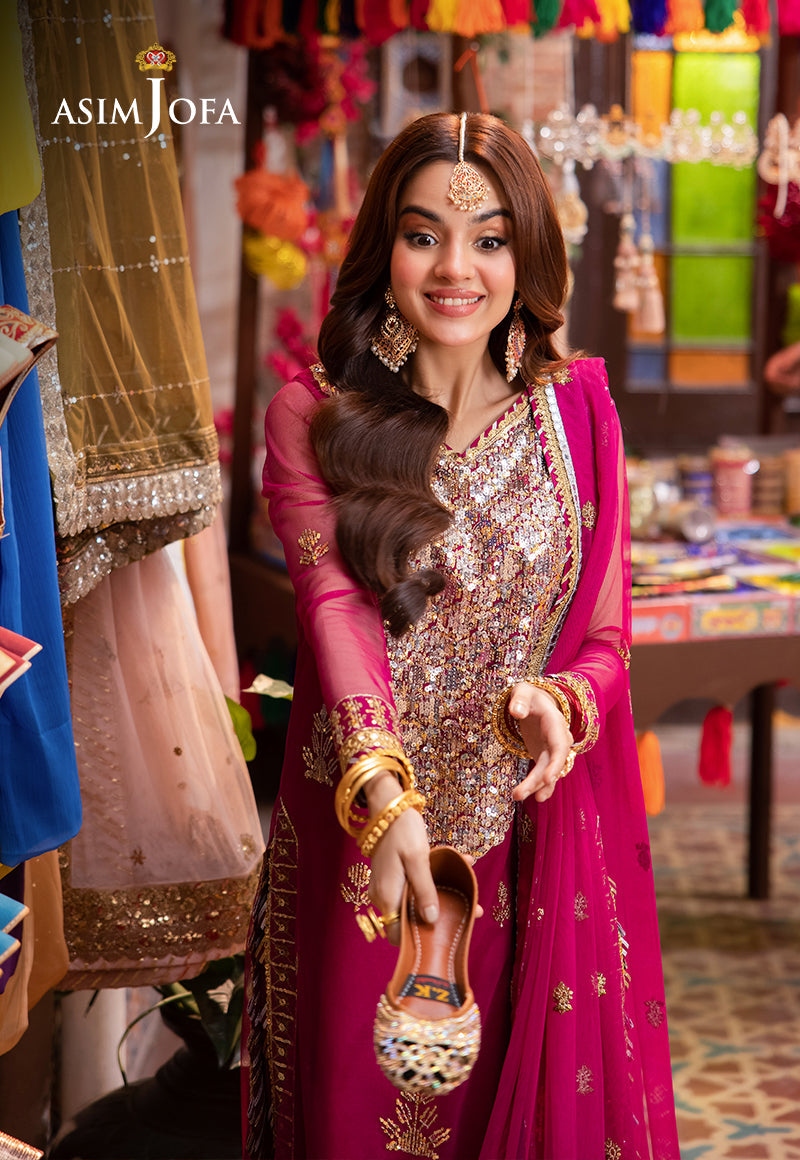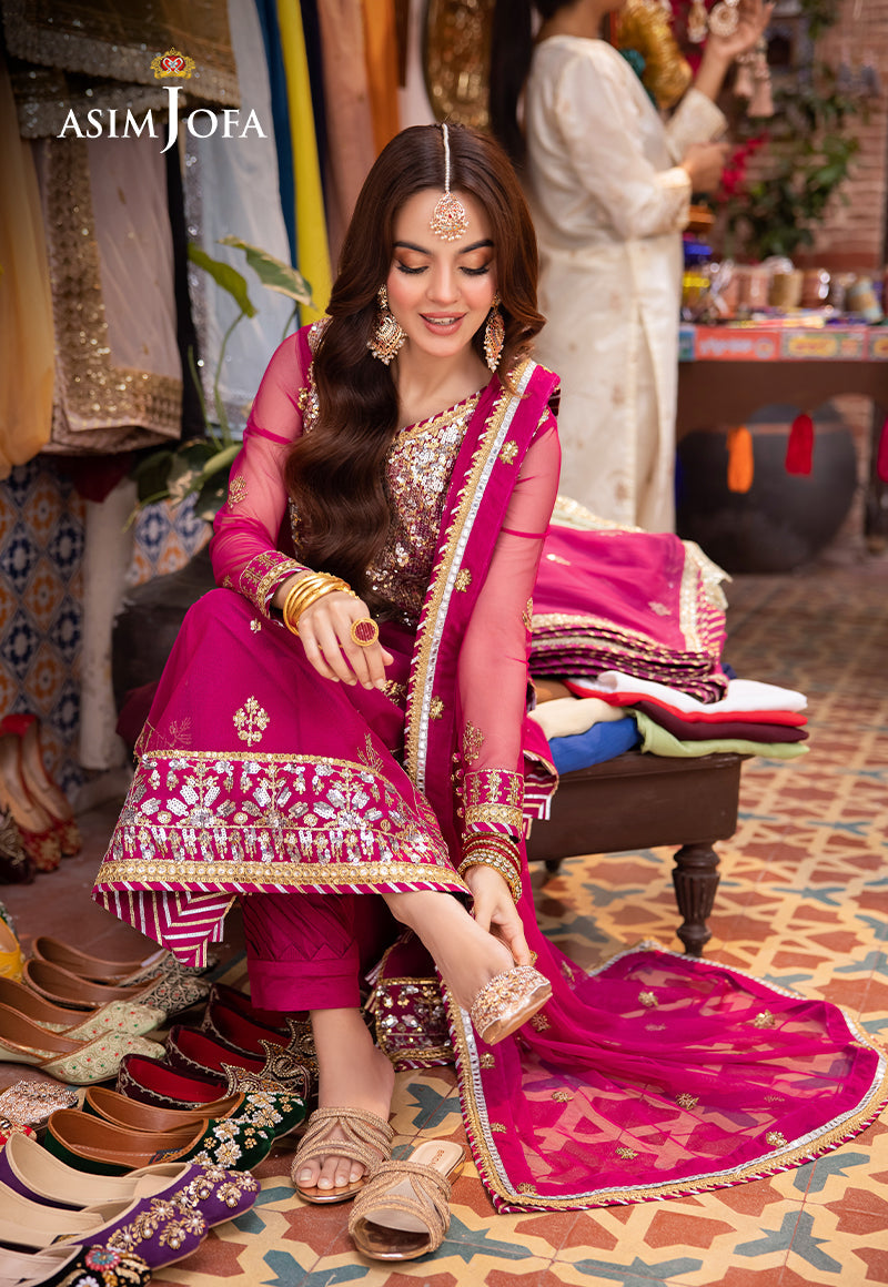 This captivating ensemble blooms with happiness like a radiant petunia. This magenta shirt features a ubiquitous neckline embroidered with a twinkling amalgam of 5mm silver and 3mm gold sequins accompanied by subtle gold zari work across the fabric, personifying moonlight on still water, the embroidery sings a joyful song on the border. An airy, embroidered dupatta completes the look, the perfect finishing touch for a celebration steeped in tradition