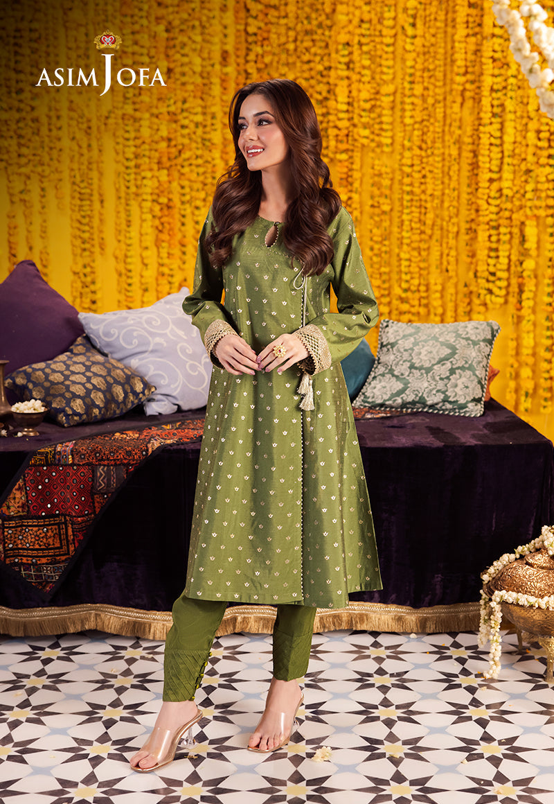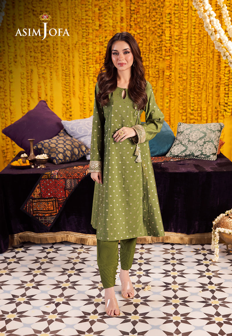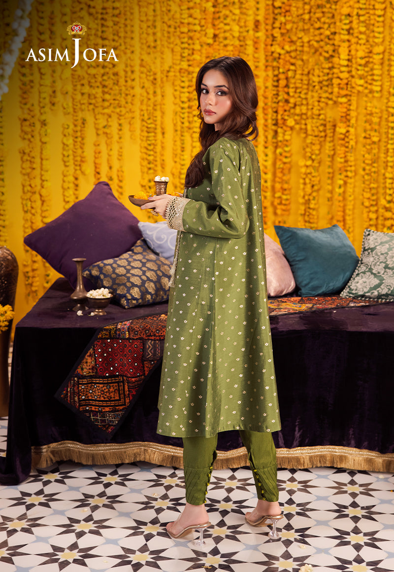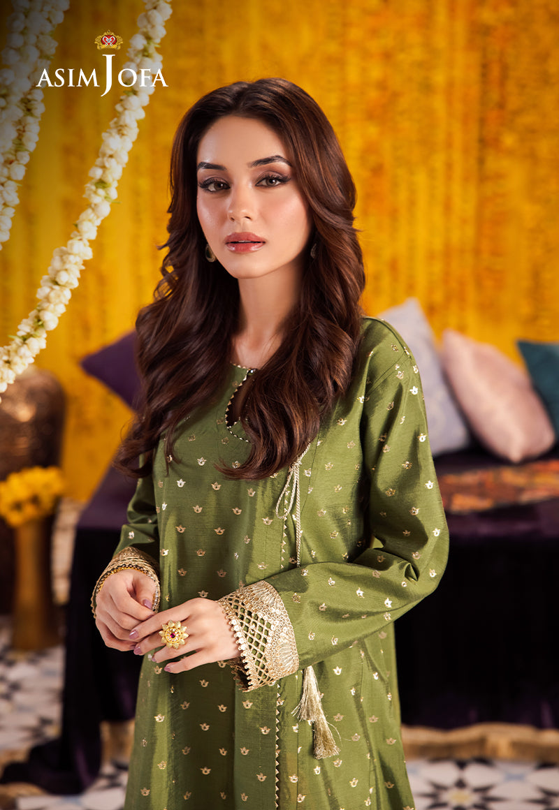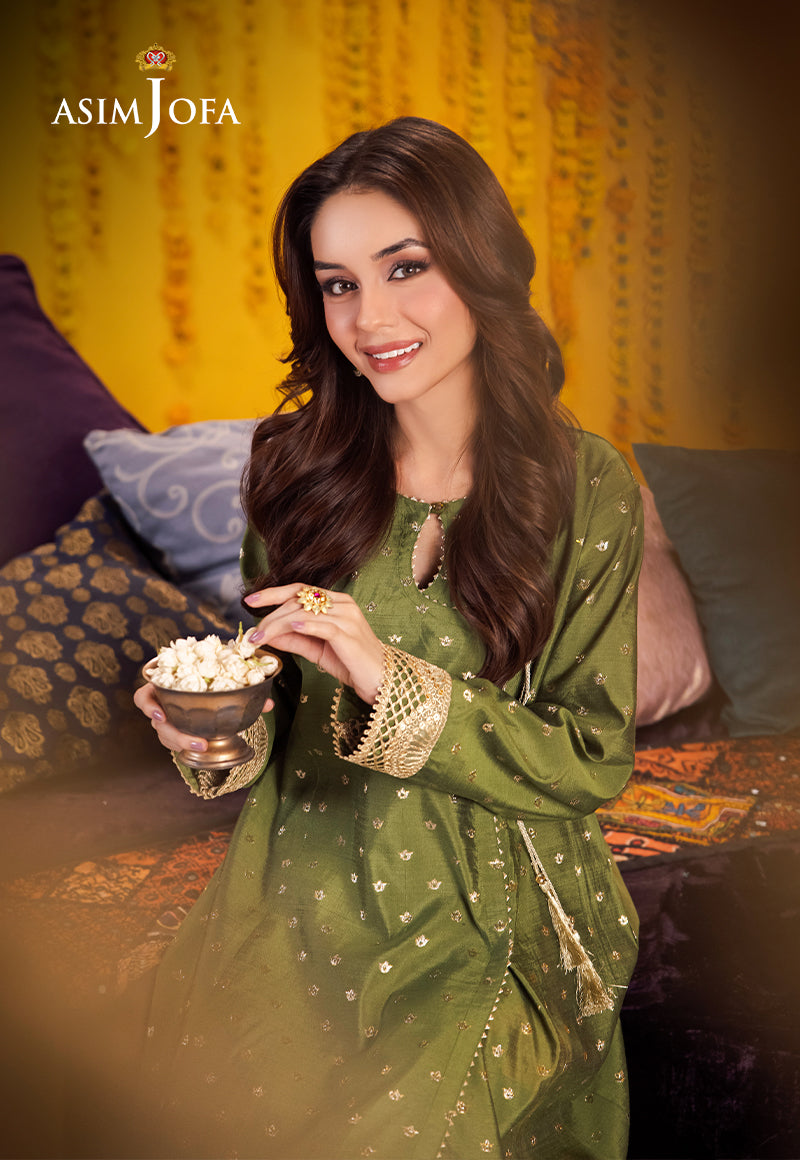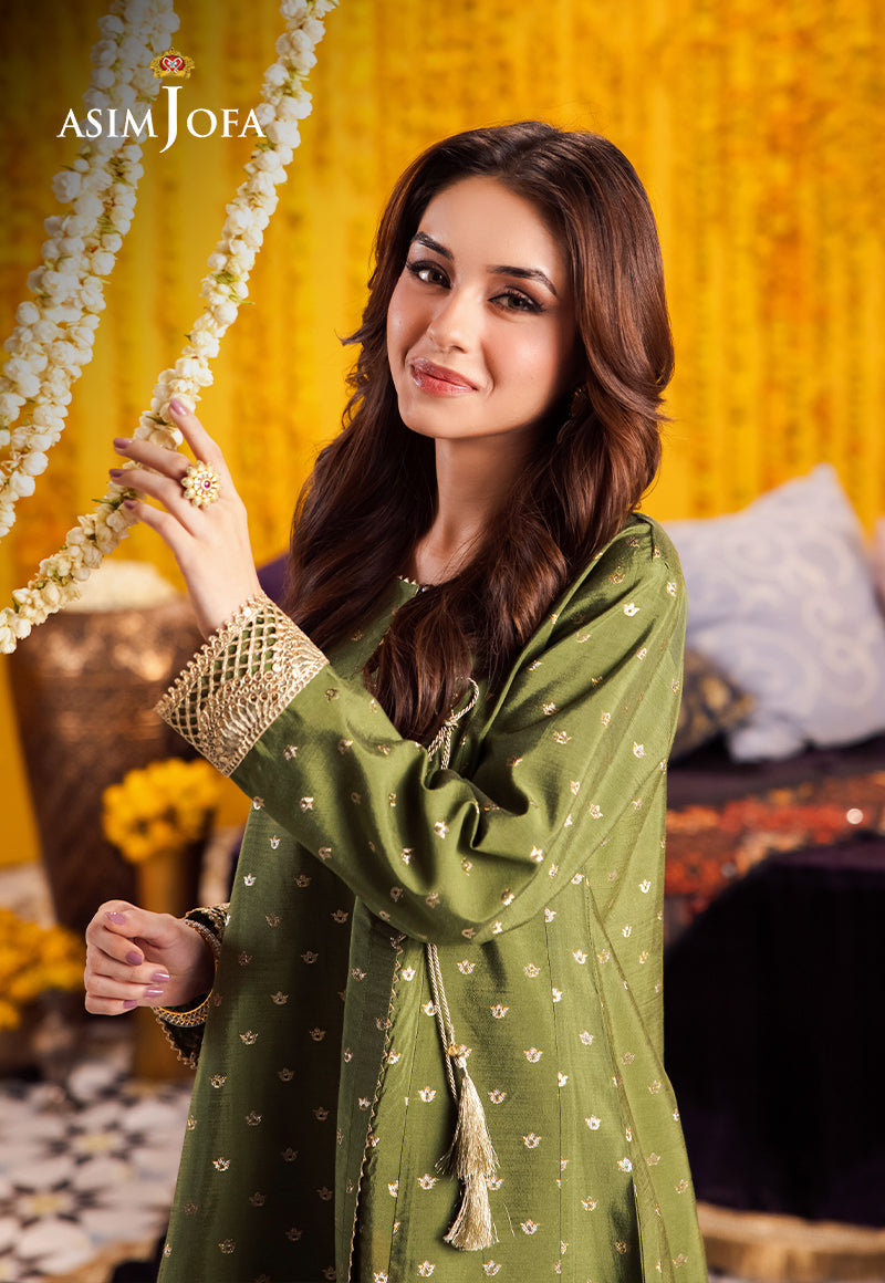 This Angrakha-style ensemble is an invitation to a vibrant soiree. The rich Jacquard fabric, adorned with zari, shimmers like a thousand emeralds under the festive lights. This mesmerizing green ensemble isn't just a dress; it's a perfect blend of effortless style and comfort.