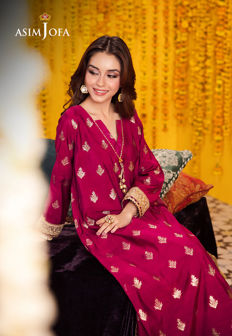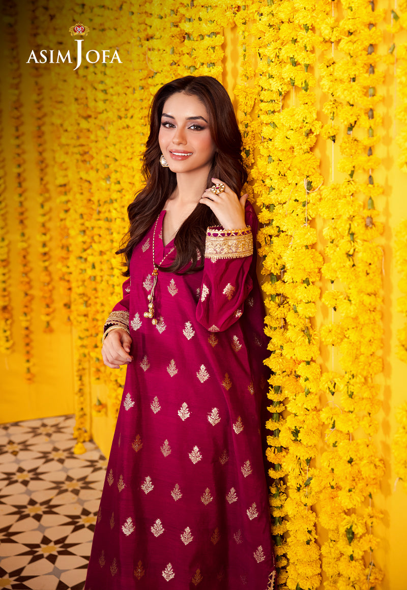This dress unfurls like a scarlet blossom, the vibrant red hue ignites the room, capturing the essence of joyous celebration. The rich Jacquard fabric, adorned with zari motifs, shimmers like embers dancing in a celebratory bonfire. The shirt is adorned with a V-style neckline with an edge to give it a vibrant energy and style.