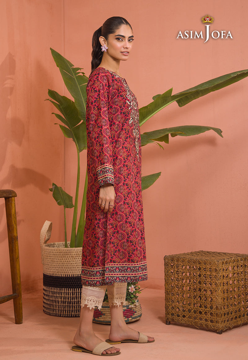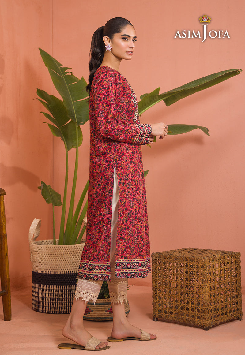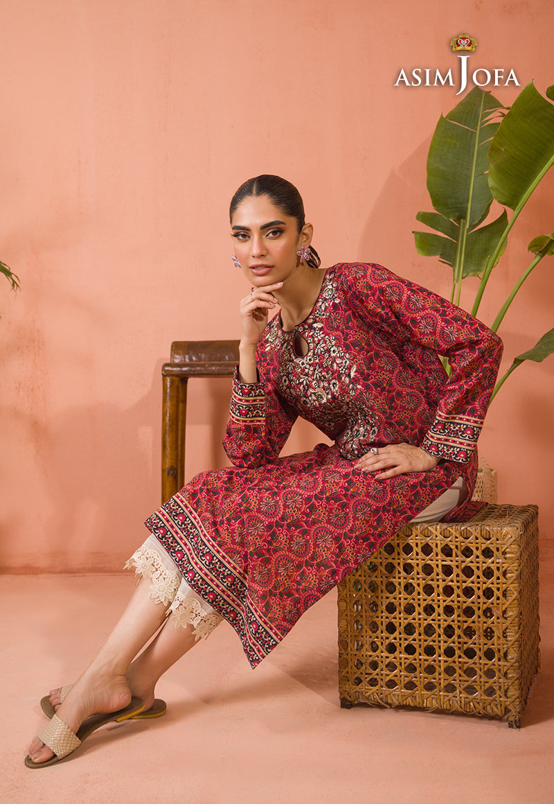 An alluring deep burgundy straight shirt adorned with a striking block print pattern, complemented by a delicately embroidered neckline.