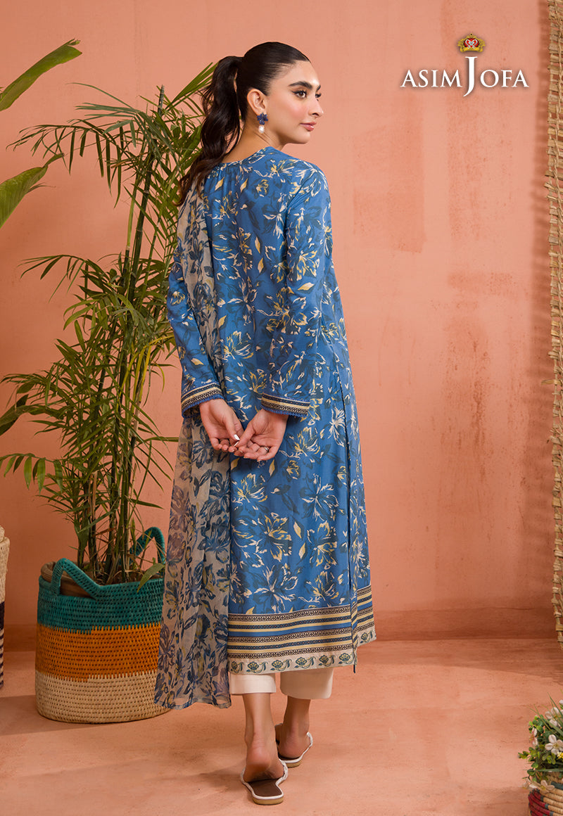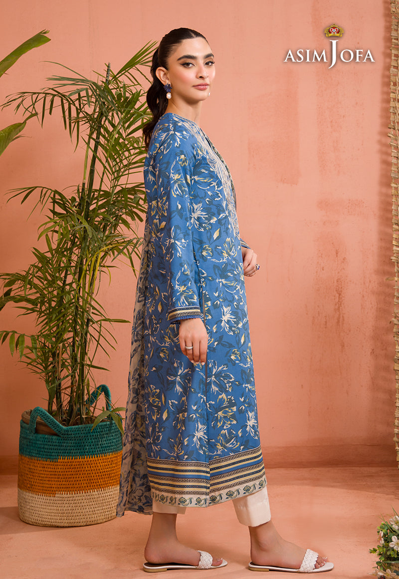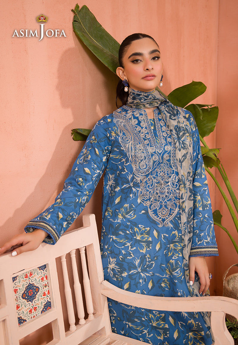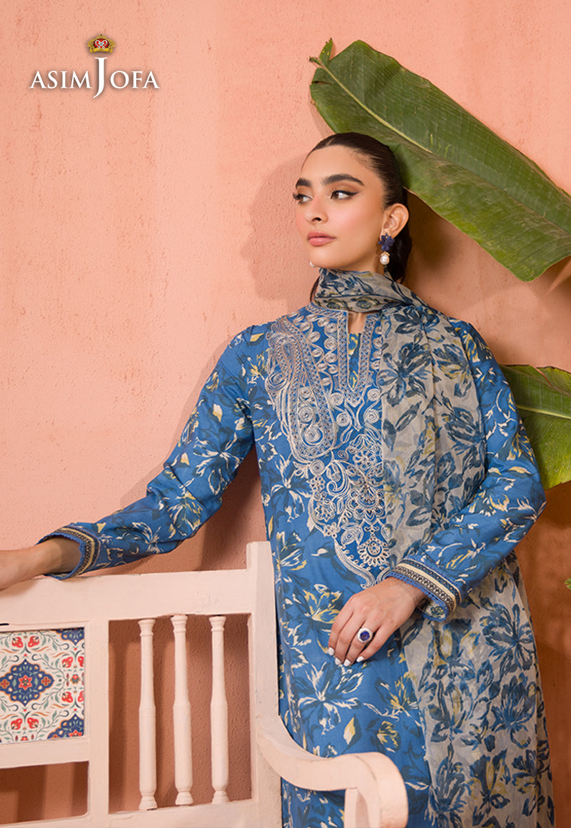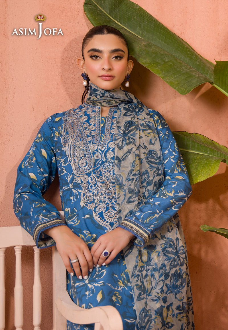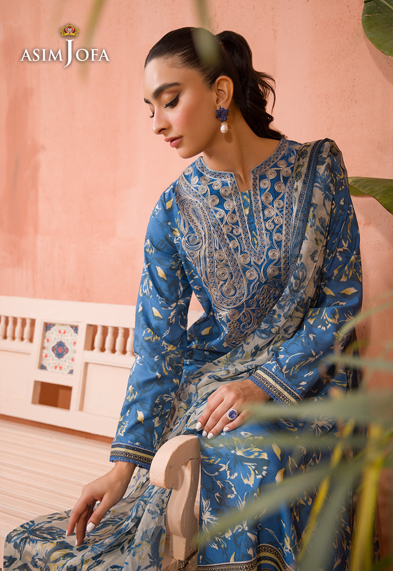Dress in style with this cobalt blue shirt and ivory dupatta set, featuring calico motifs that beautifully complement the charming paisley and floral embroidery on the neckline.