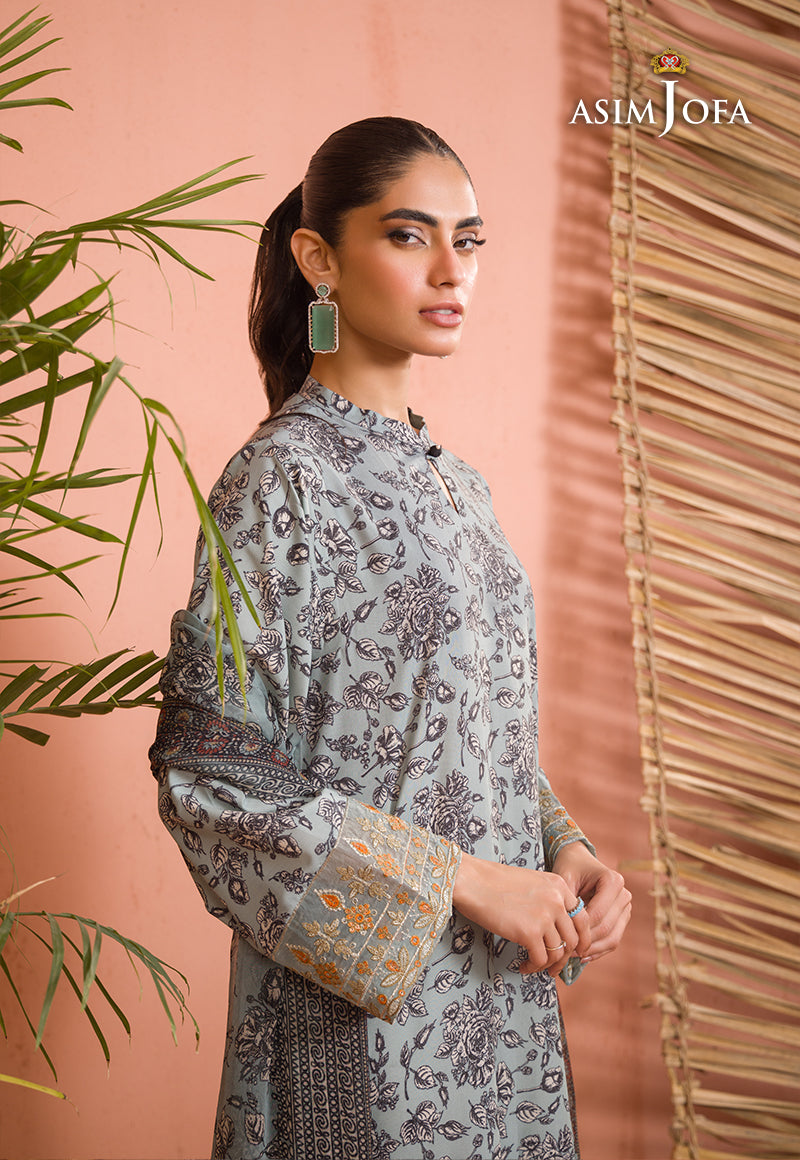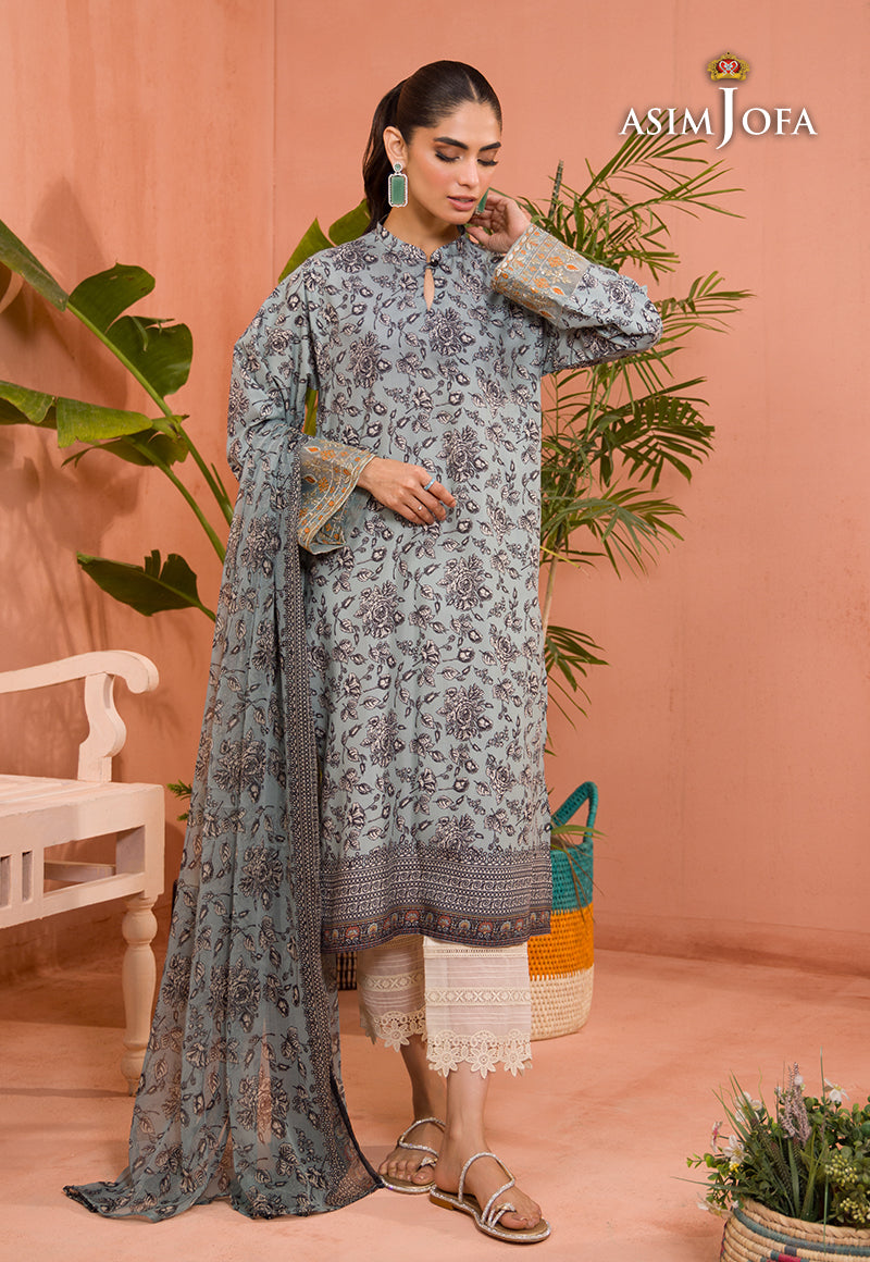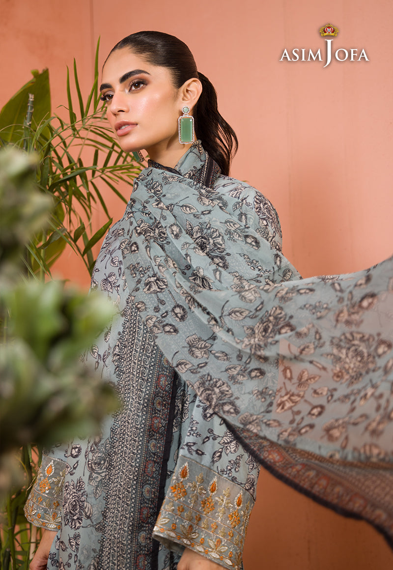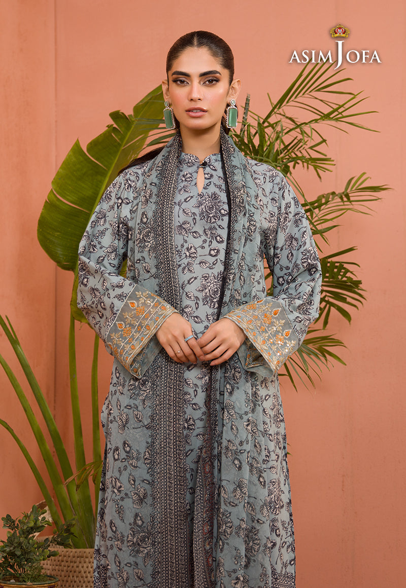 Embrace serenity in a blue lagoon ensemble with a shirt and dupatta featuring botanical abstract motifs, majestic borders, and a sleek band collar.