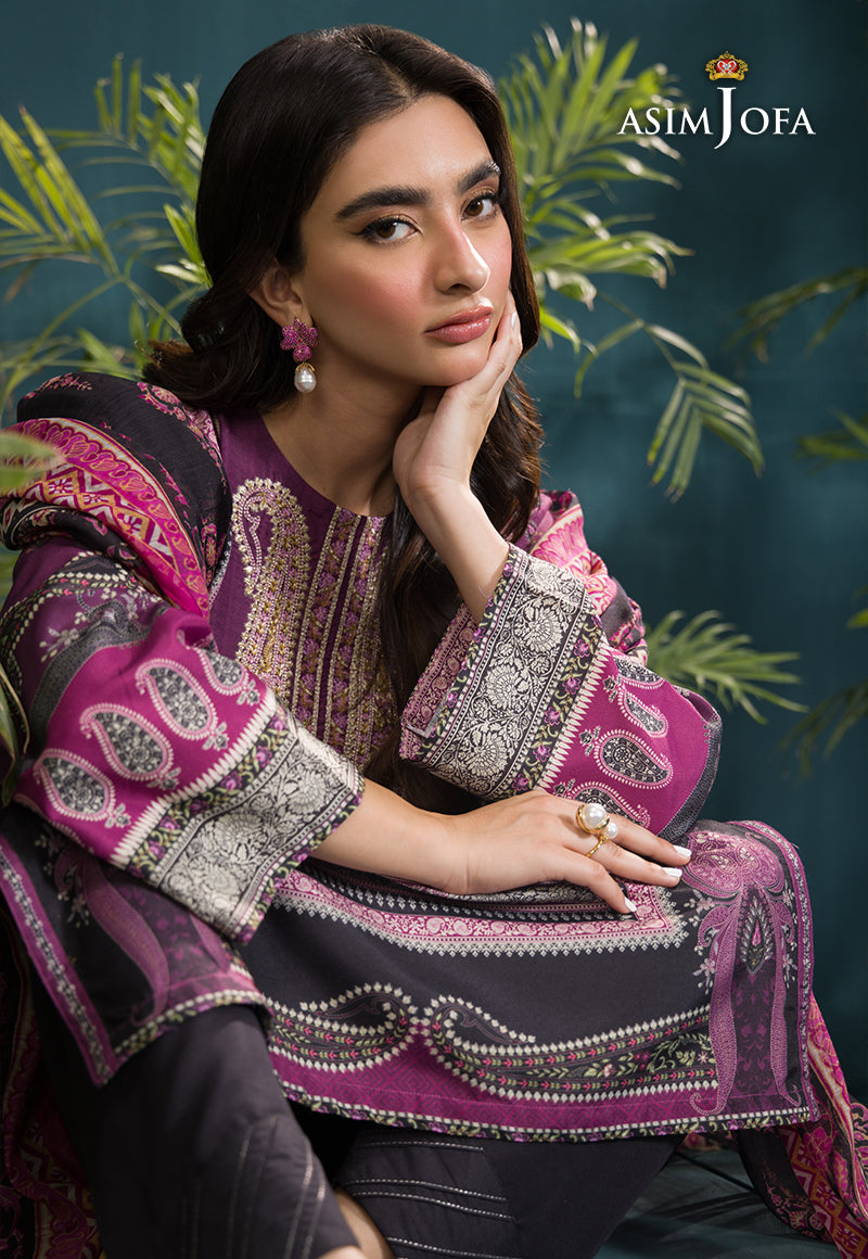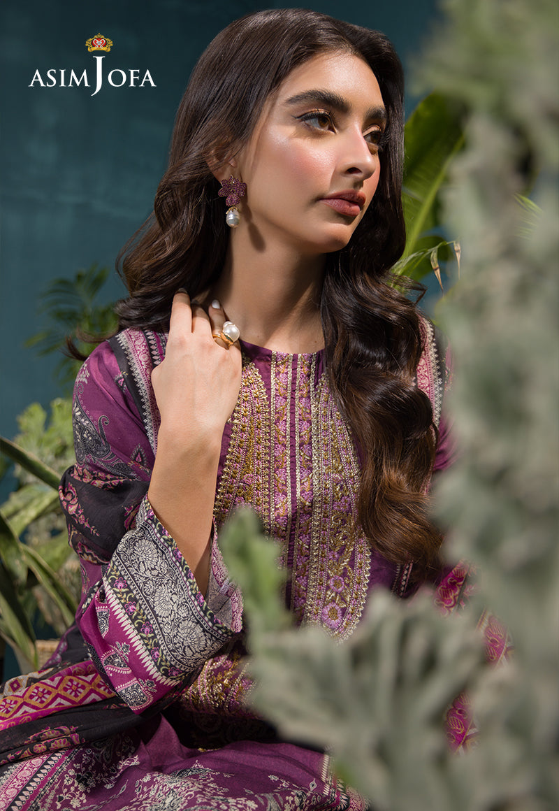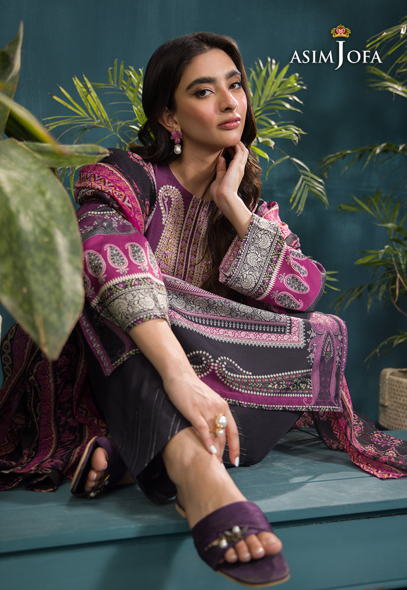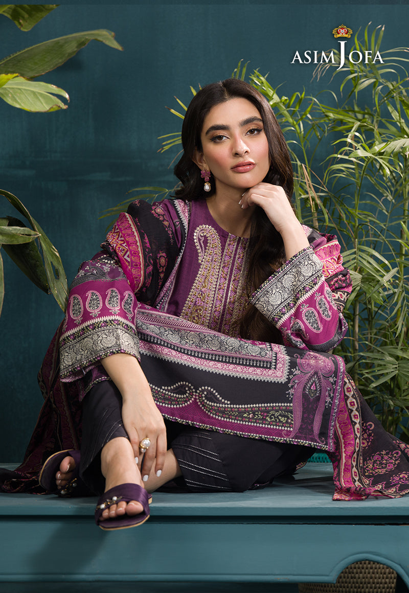 Indulge in elegance with this plum-toned ensemble featuring exquisite embroidery, an onyx Indian Lawn dupatta, and solid trousers.