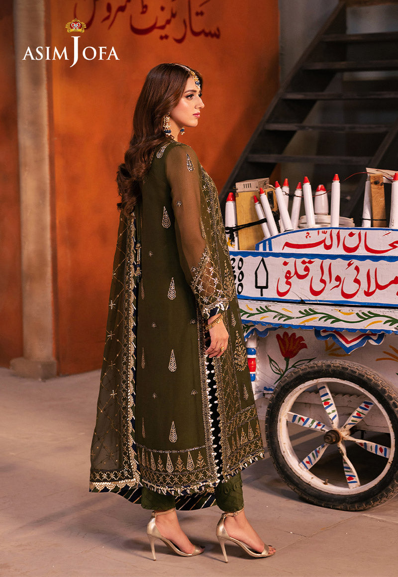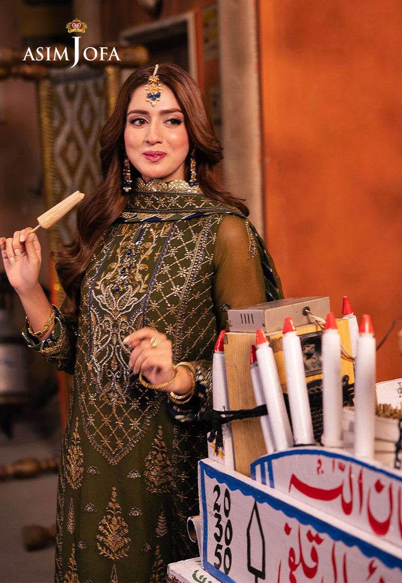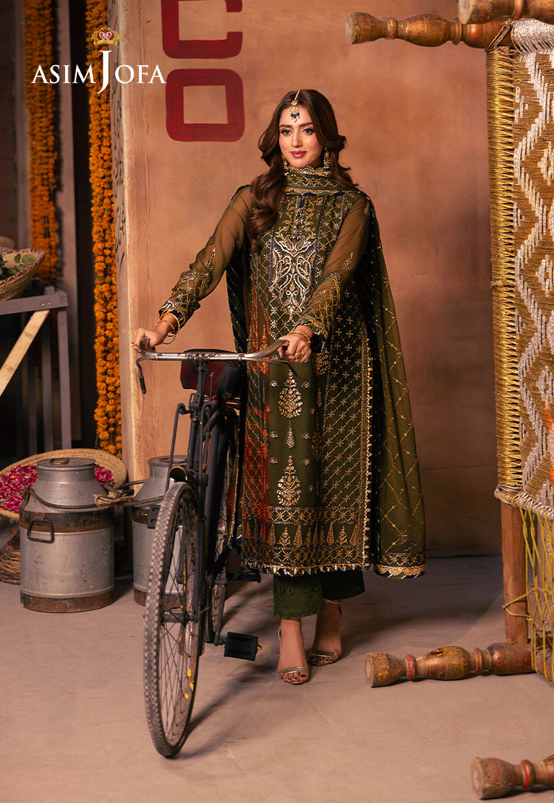 Emerge from the forest's embrace in this verdant green ensemble, glistening like morning dew on vibrant leaves. The shirt unfurls like a fresh leaf, its embroidery a celebration of nature's artistry. Two-toned antique gold zari, like sunbeams filtering through branches, intertwines with navy-blue threads, the deep shade of a hidden forest pool. Scattered, pale gold sequins catch the light, mimicking the first kiss of sun on a dewdrop clinging to a wildflower. Paired with a stunningly embroidered dupatta, this ensemble isn't just an outfit; it's a serenade sung by the wilderness itself.