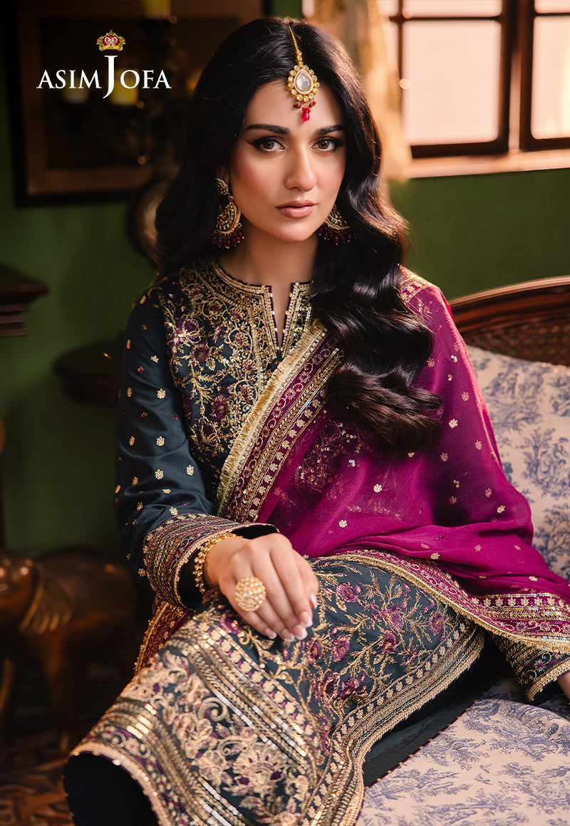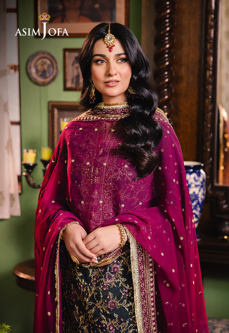 Step into a secret garden with this verdant ensemble, a whisper of captivating stories. The green shirt shimmers with a subtle sheen of gold sequins, its surface adorned with a delicate tapestry of floral embroidery crafted in antique gold, dual-toned zari and magenta thread, showcasing the meticulous artistry. The neckline, a breathtaking display of grace, redefines elegance. A wispy chiffon dupatta, in striking contrast with its rich maroon hue, echoes the collection's luxurious narrative. This exquisite combination creates a perfect outfit for a soiree.