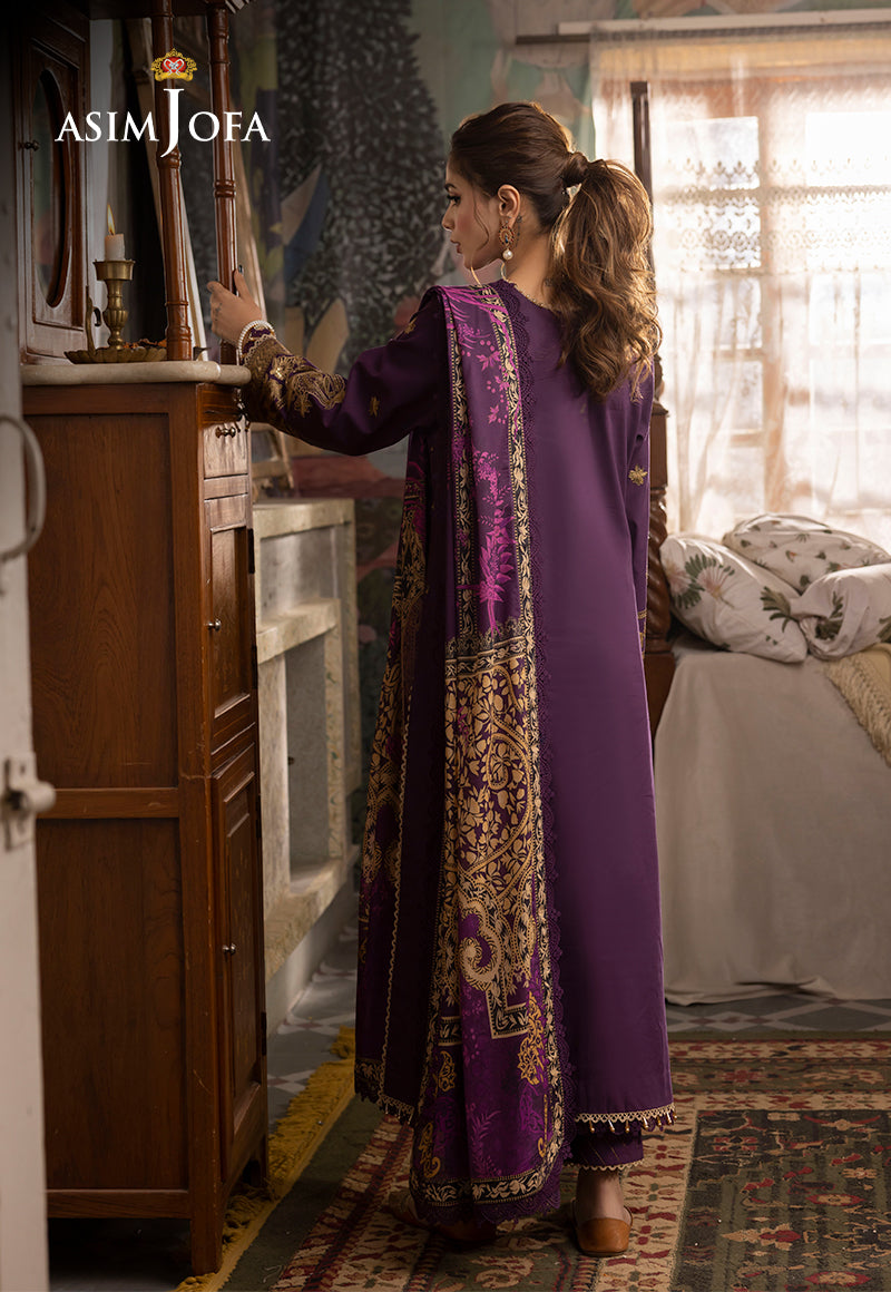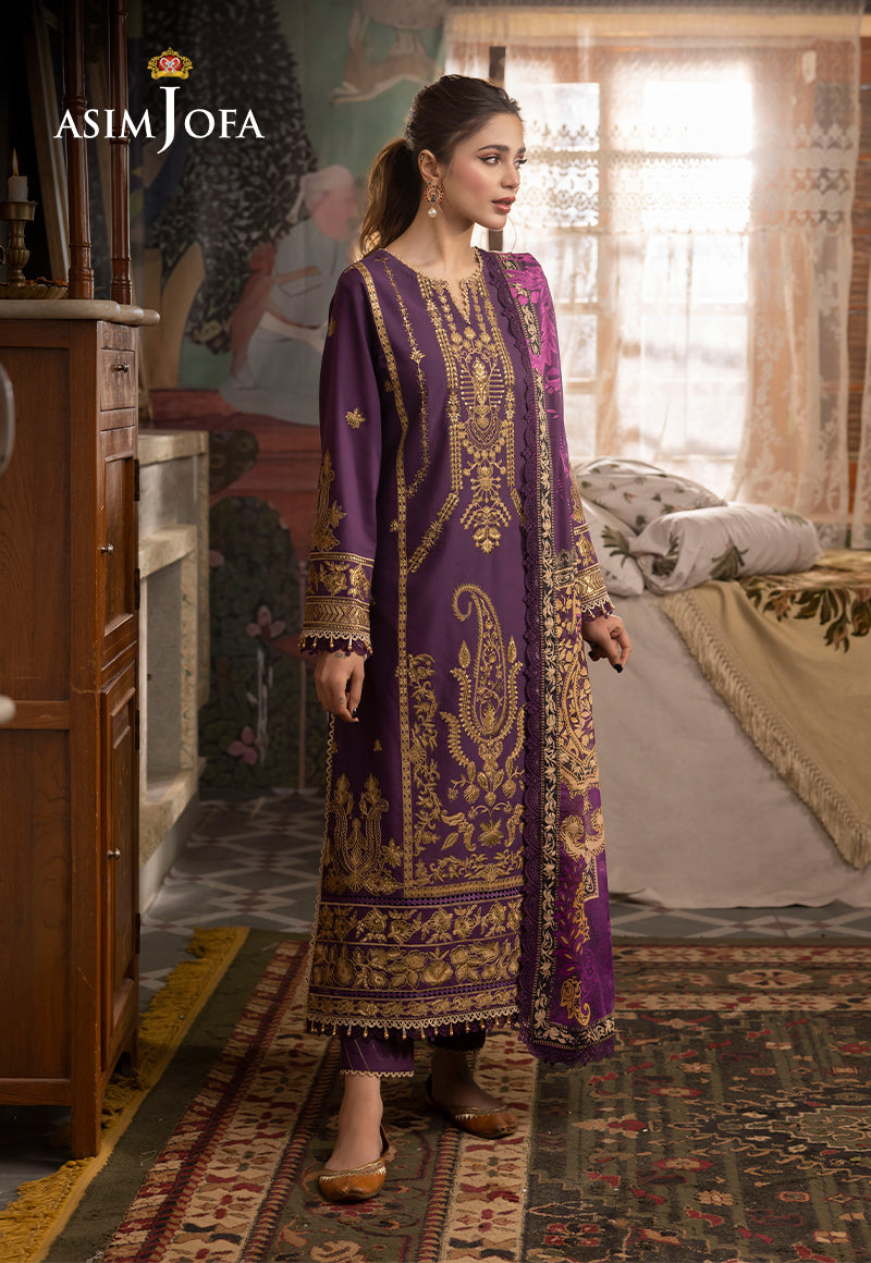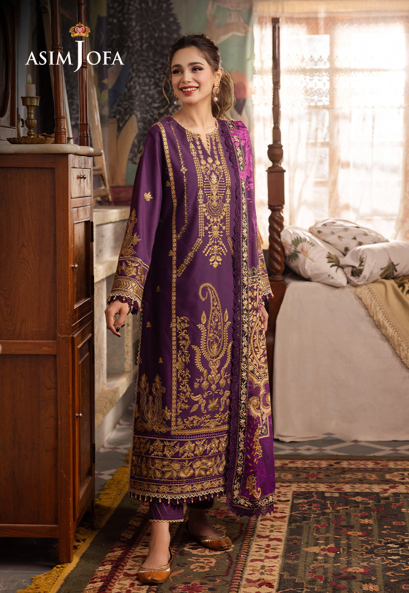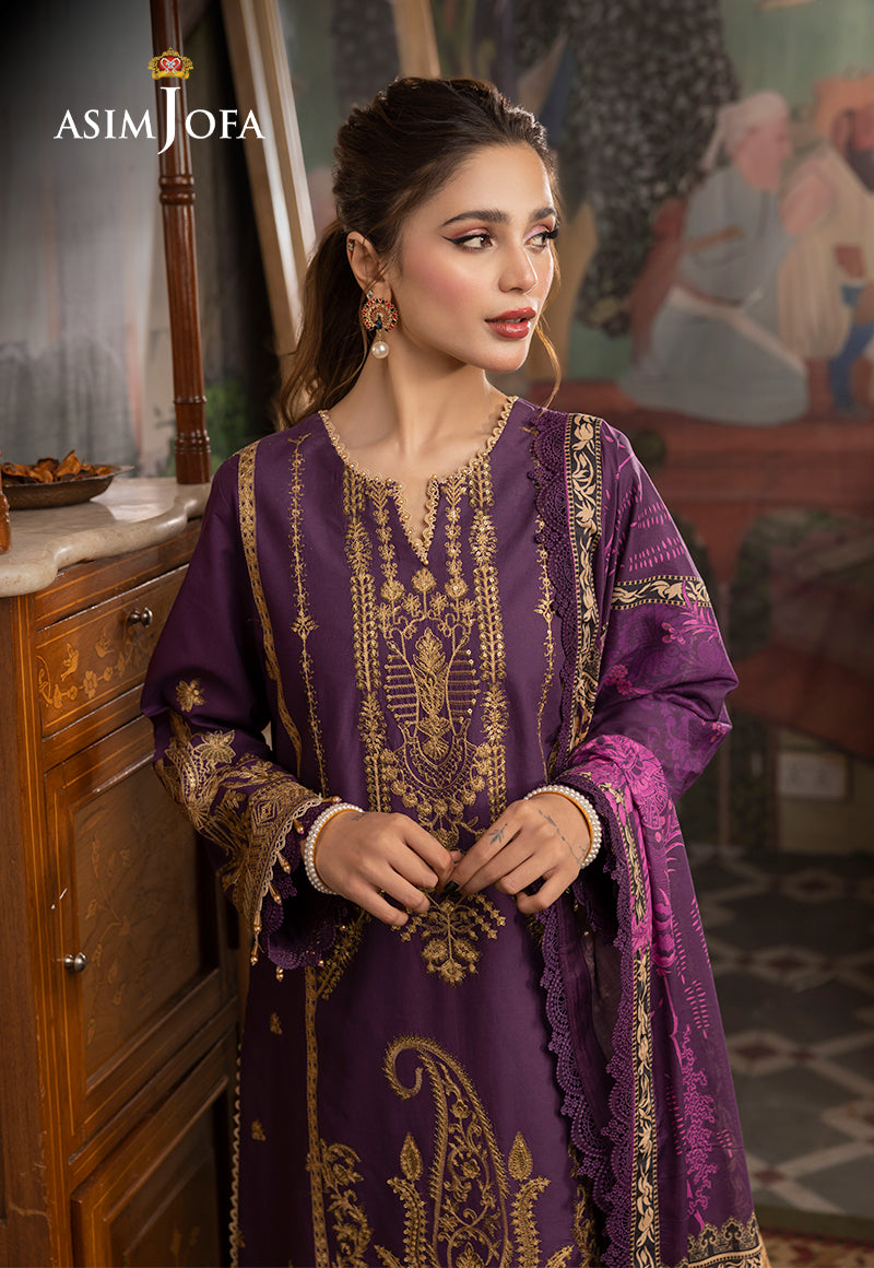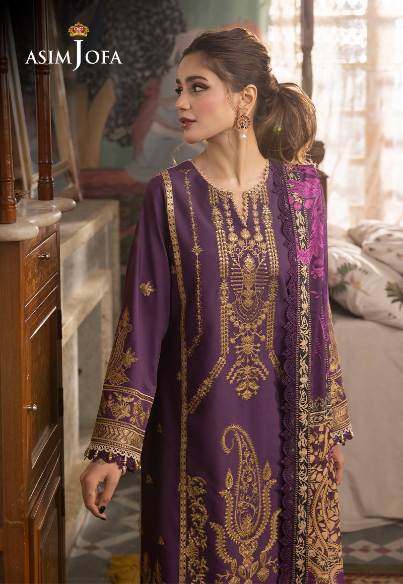 Immerse yourself in a royal symphony of elegance with this purple ensemble where every stitch creates a melodic narrative. The embroidered panels a regal overture are adorned with beige threadwork and sequins reminiscent of musical notes that dance in harmony. The embroidered sleeves with delicate borders become the rhythmic undertones adding a touch of grace to the ensemble. The trouser grounds the outfit in understated sophistication. Paired with a lawn dupatta, the ensemble becomes a symphony of colors and motifs, creating a visual masterpiece that resonates with regal allure.