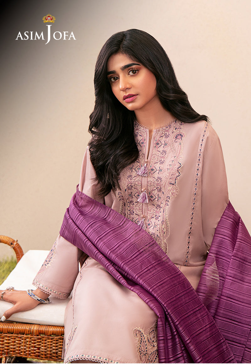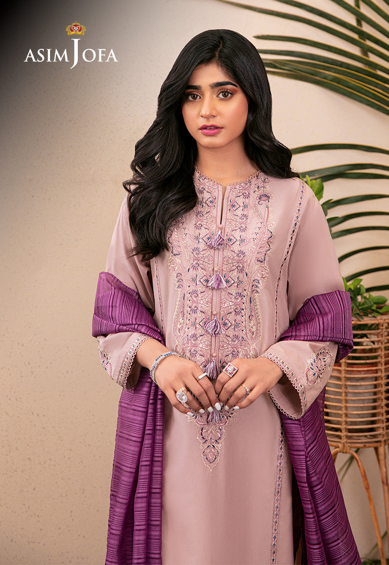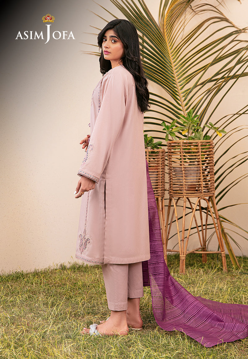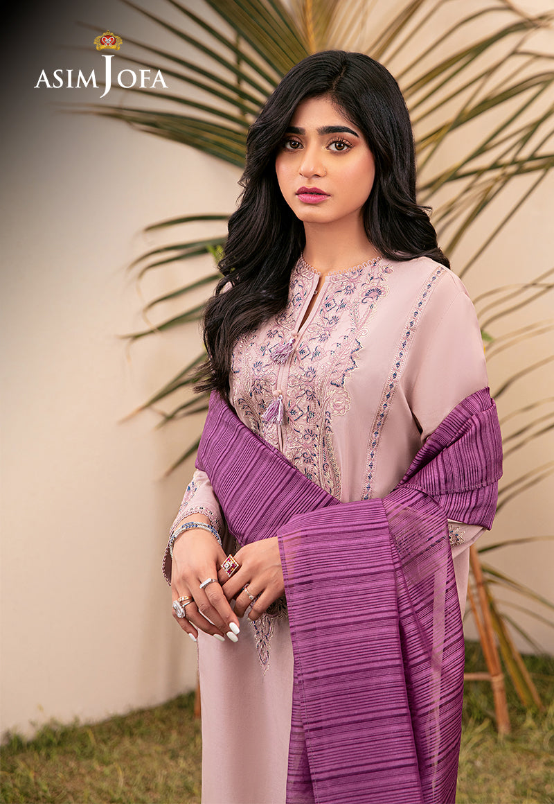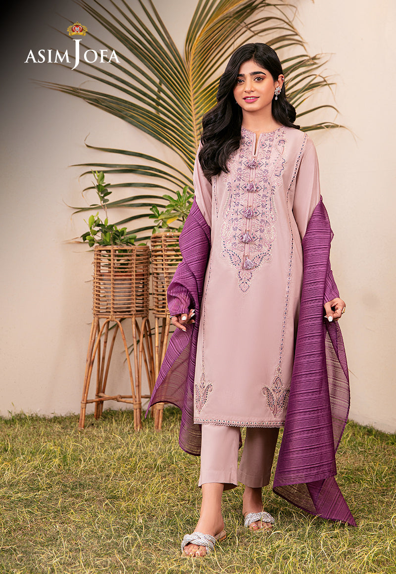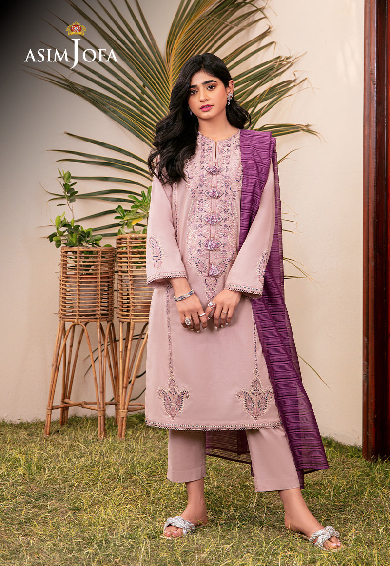 Dive into this embroidered light purple ensemble paired gracefully with a purple dupatta – a triad of elegance that captivates with its rich color.