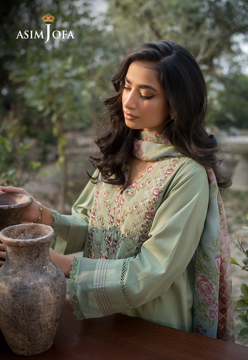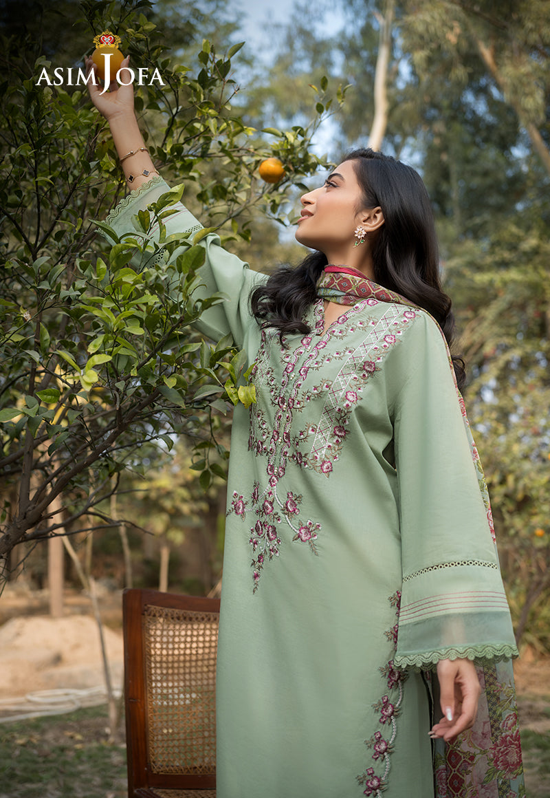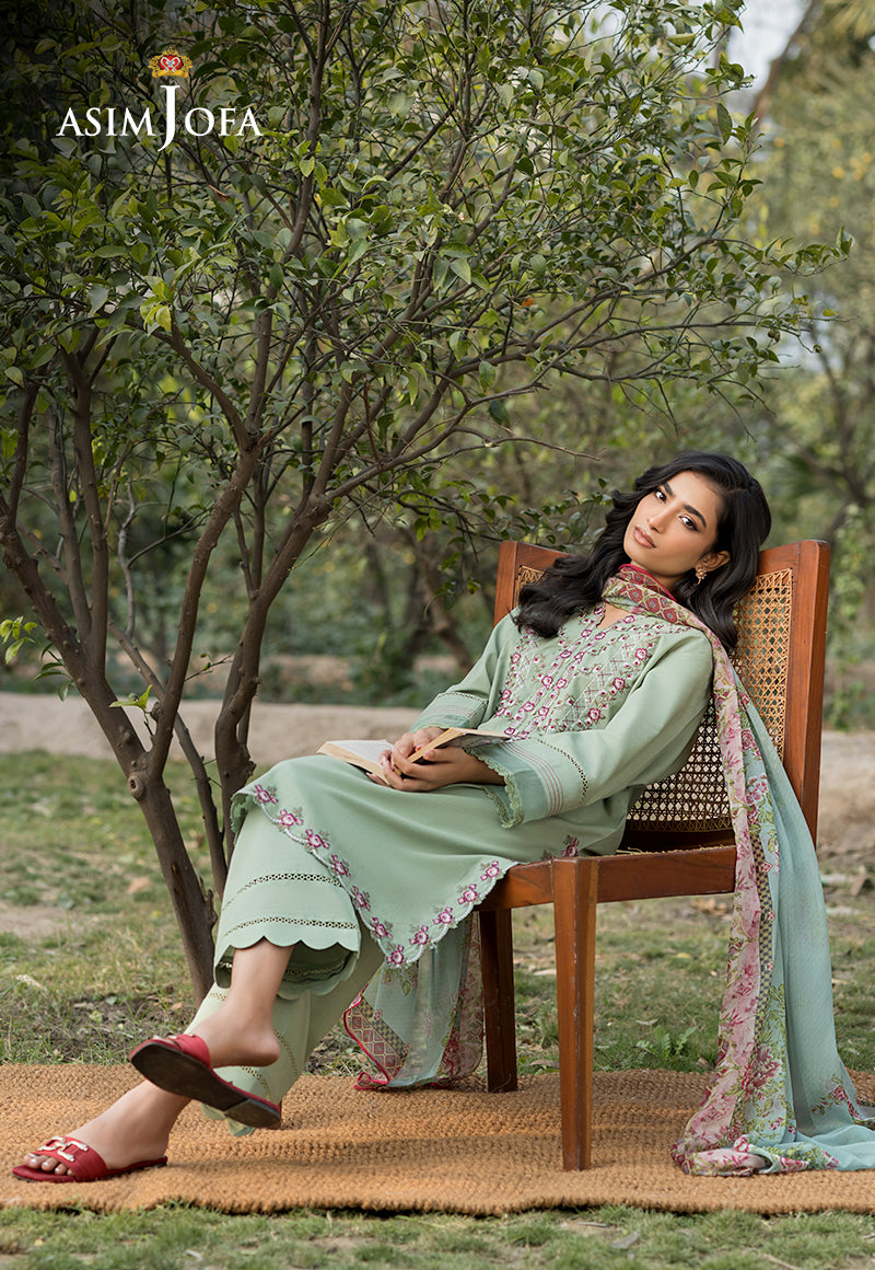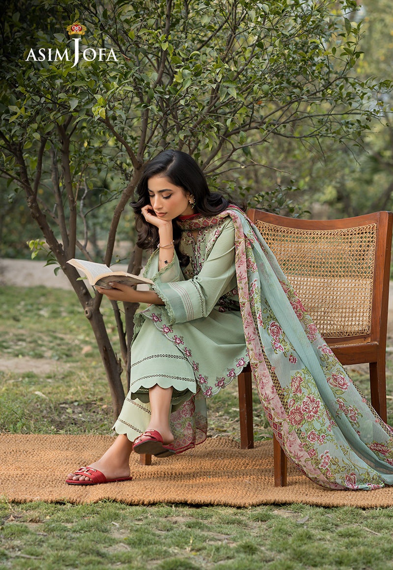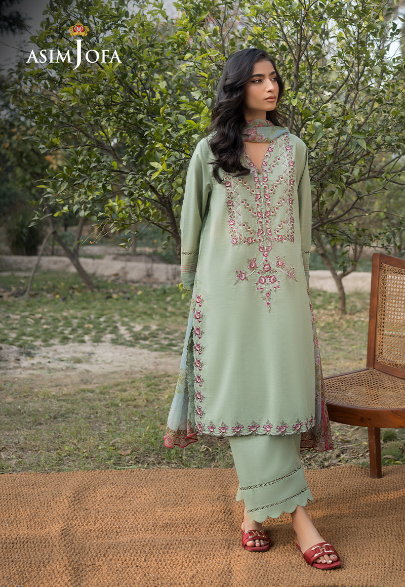 Radiating effortless charm, this light green ensemble is a perfect exhibit of elegance. The shirt features a beautifully embroidered neckline in a medley of colors, creating a striking focal point. Scalloped embroidery graces the edges and hem, adding a touch of finesse to the design. The printed chiffon dupatta drapes gracefully, completing the look, the scallops detailed trousers offer a modern appeal, making this outfit a true statement of refined style.