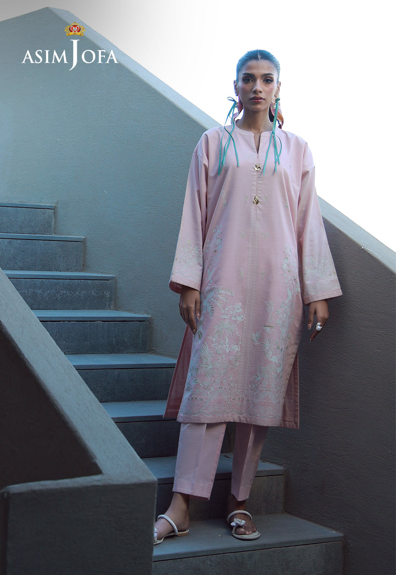 This delicate pink ensemble radiates a soft, natural charm. The pastel-hued shirt, a whisper of springtime, features a gorgeous nature-inspired print, where botanical motifs and organic forms intertwine with effortless grace. Paired with elegantly simple plain trousers, the ensemble evokes the serenity of a blooming garden.