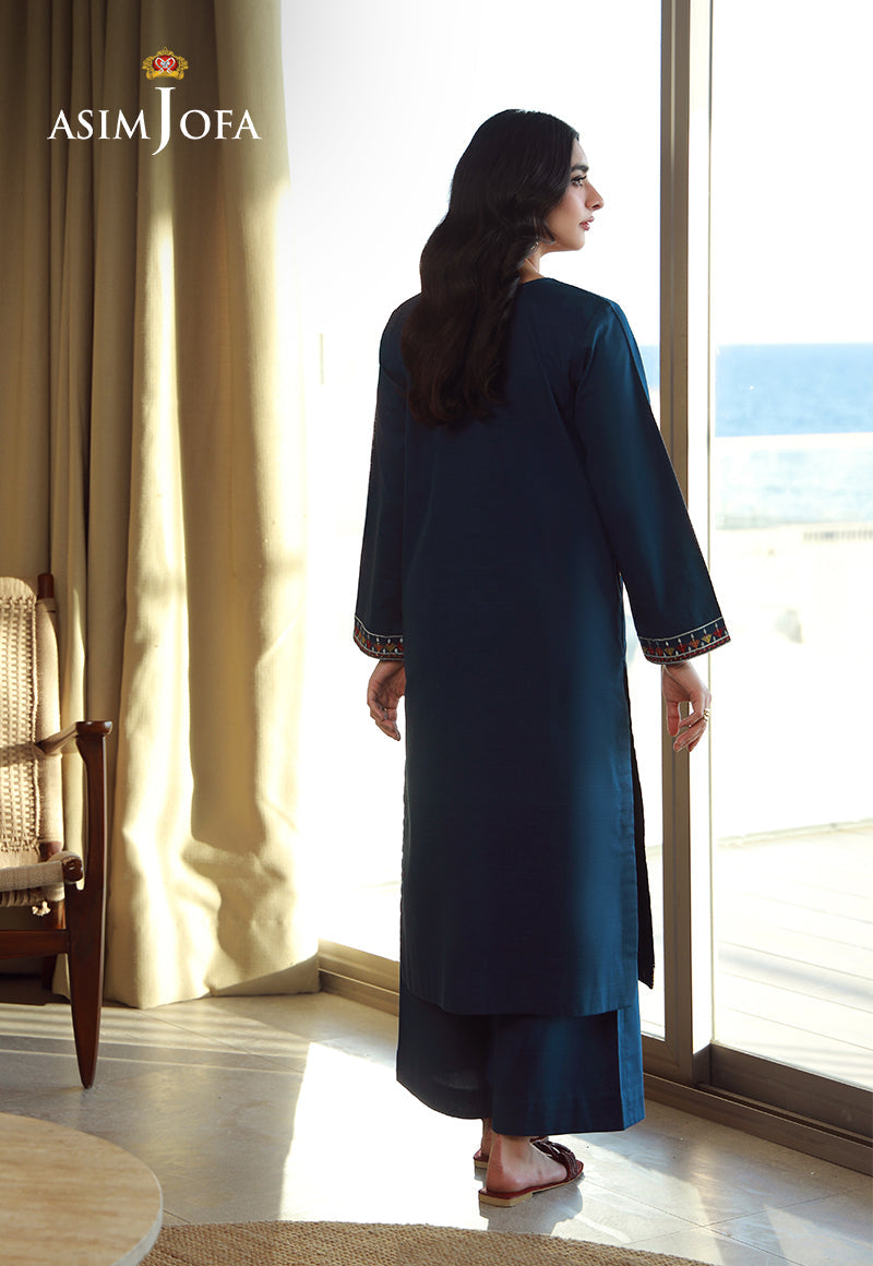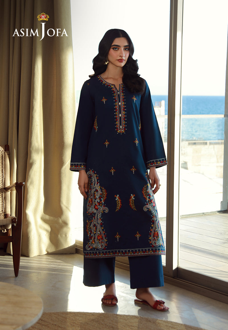 This sophisticated navy ensemble showcases a rich tapestry of cultural artistry. The shirt, a deep and elegant hue, is meticulously embroidered with ethnic elements, brought to life through vibrant, multi-hued threadwork. The plain trousers provide a refined look, making this a truly gorgeous outfit.