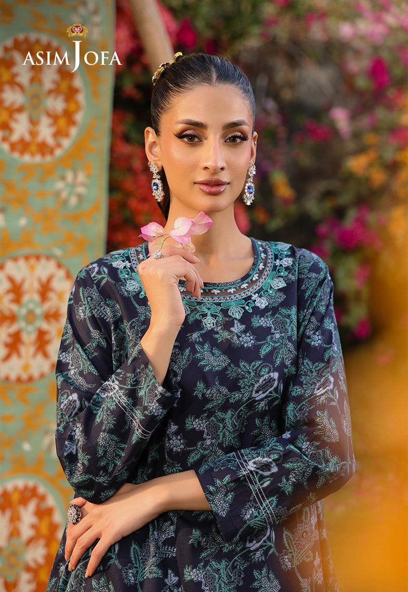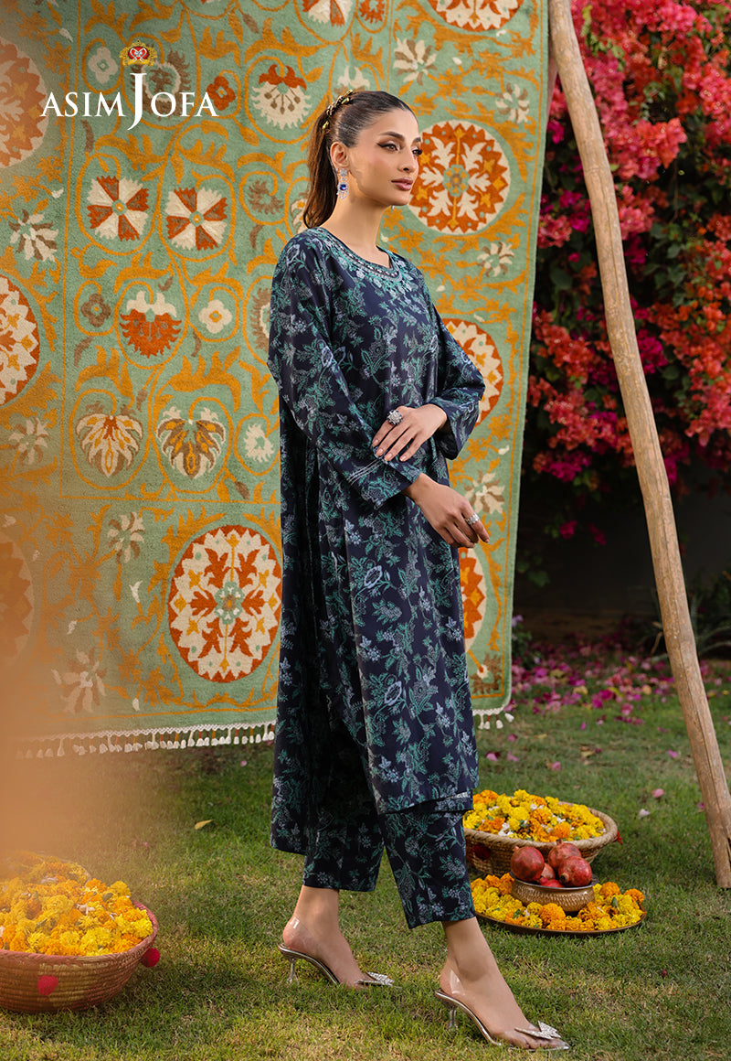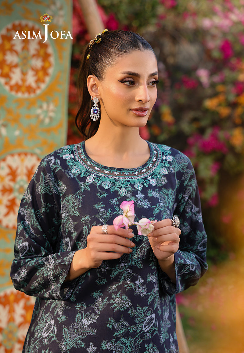 Embrace timeless elegance with this dark blue ensemble. Adorned with a captivating all-over print on both the shirt and trousers, the look is effortlessly chic. The beautifully embroidered neckline adds a touch of refinement, making this outfit a perfect choice for a day out with friends.