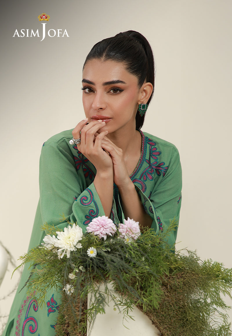 Rooted in heritage yet styled for today, this green ensemble celebrates cultural artistry through striking motifs that grace the front with presence and poise. The design feels expressive yet balanced, offering visual impact without excess. Scalloped detailing along the hem adds a refined contour, framing the silhouette with subtle ornamentation. Paired with plain trousers, it delivers a look that honors tradition with contemporary ease.