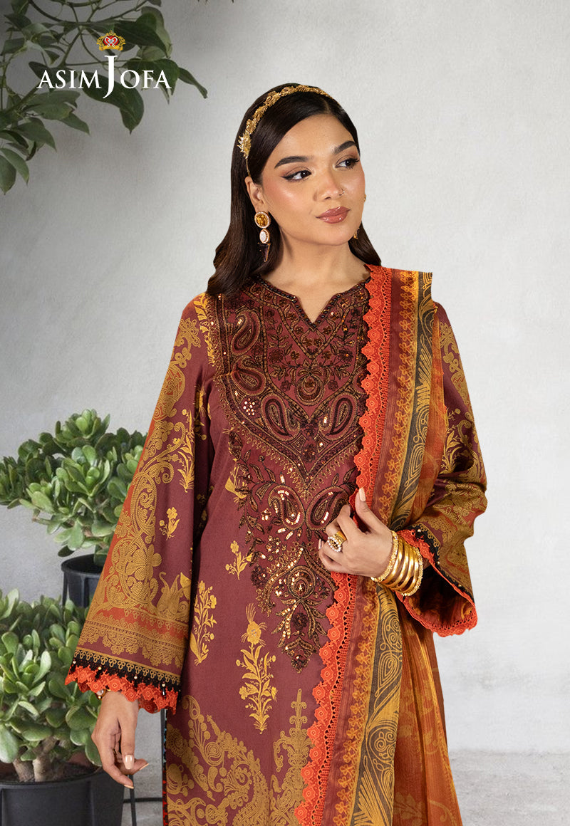 Discover the allure of tradition redefined with Asim Jofa’s “Asra Collection.” This ensemble features a digital printed jacquard shirt that radiates with an embroidered neckline, a homage to the intricate artistry of South Asian motifs. The maroon canvas is a celebration of cultural opulence while the digital gold Mesuri dupatta adds a layer of modern sophistication making it a perfect symphony of past and present.