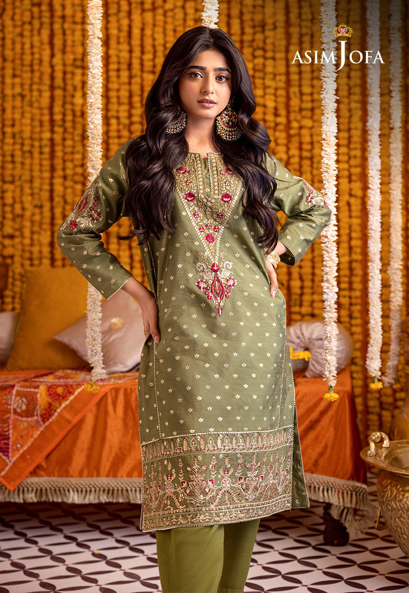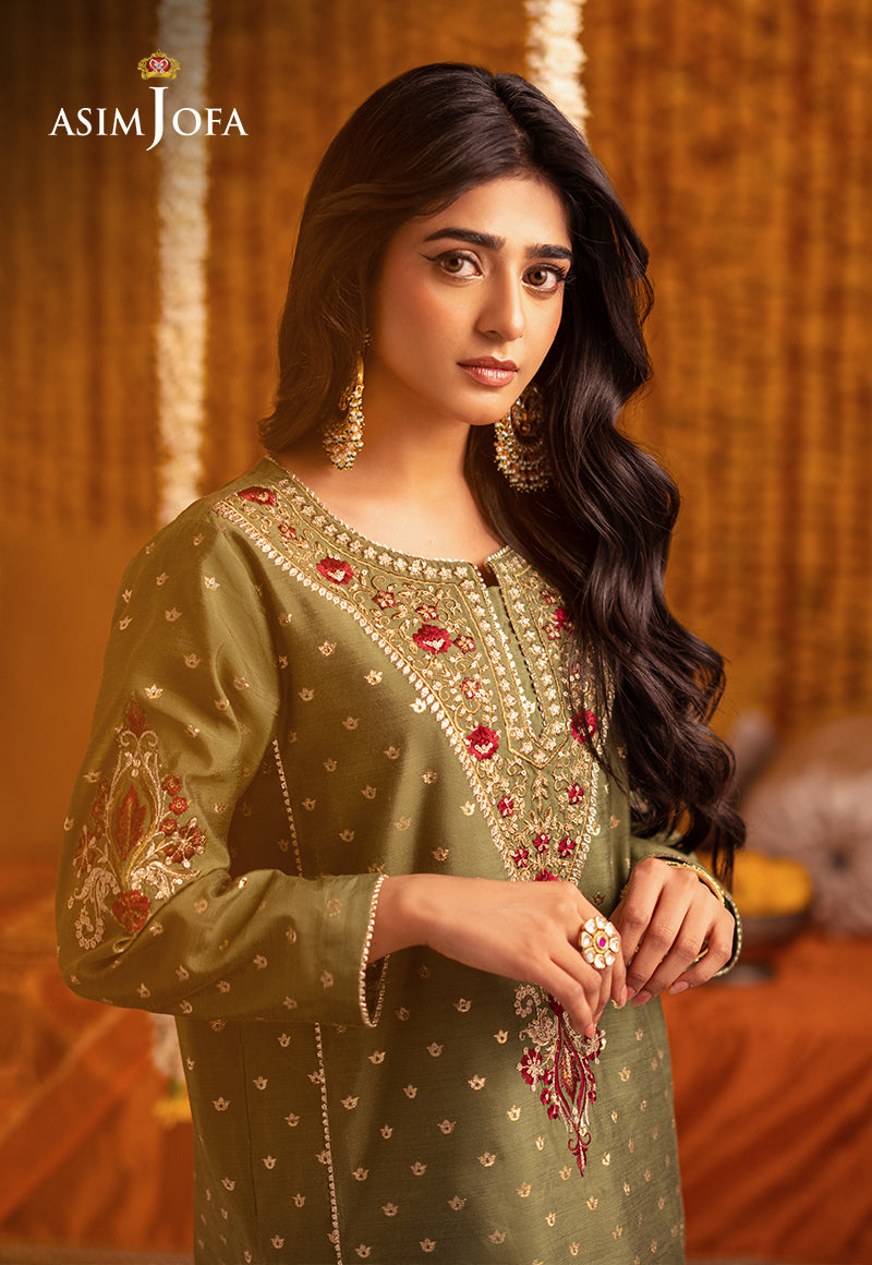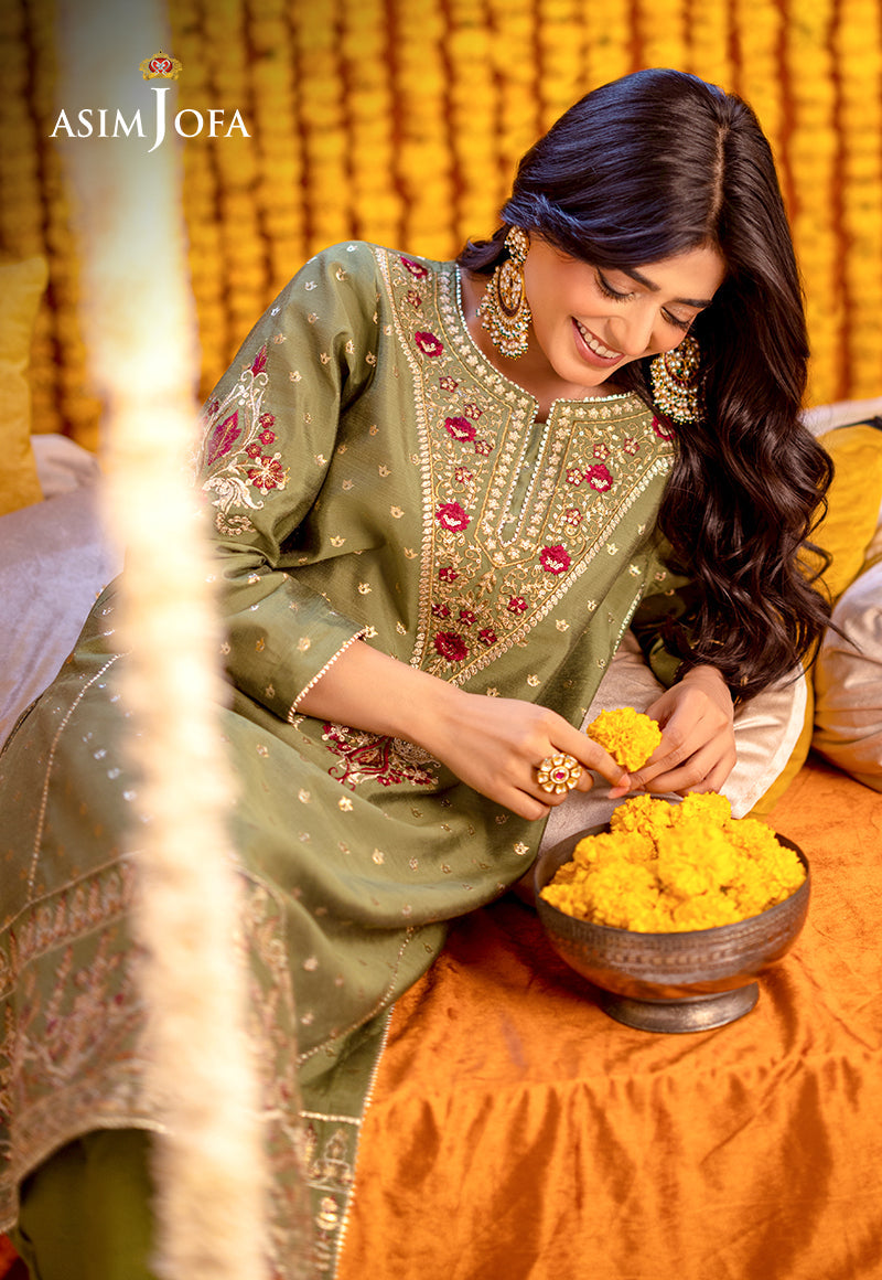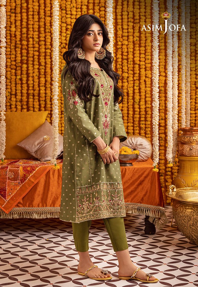 A beige green number inspired by Mughal motifs with floral print, paired with a complementary trouser.