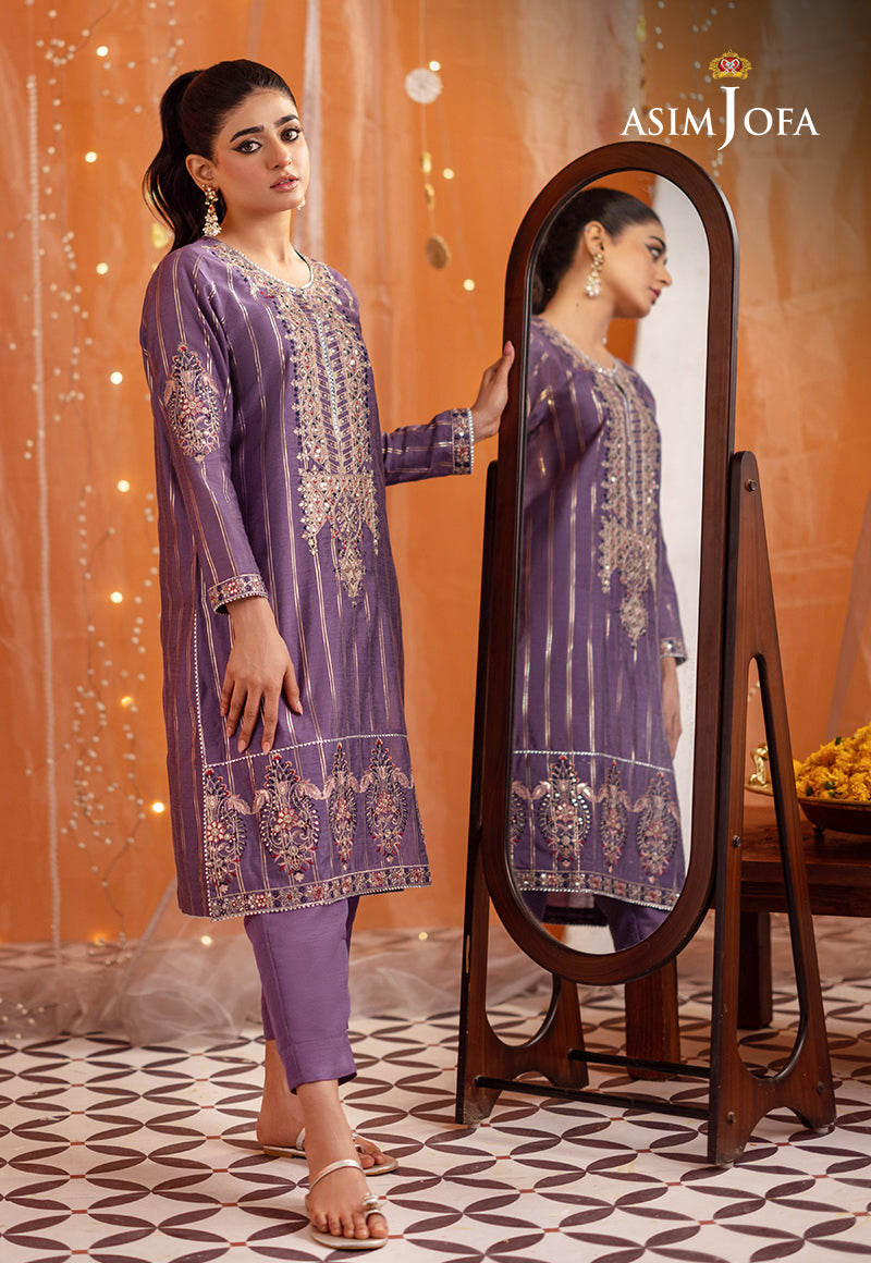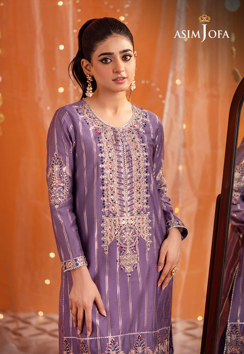 A midnight purple outfit with intricate embroidery on neckline and borders, along with bunches on sleeves, creating a symphony of elegance.