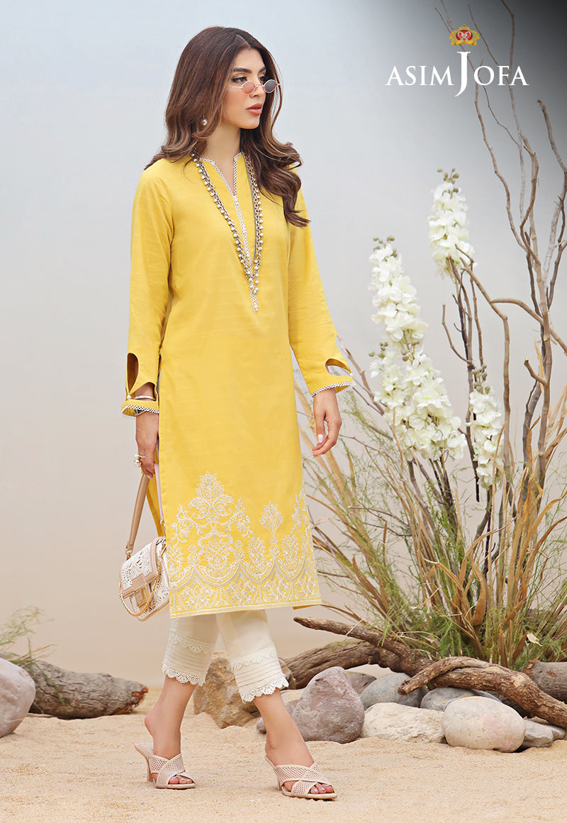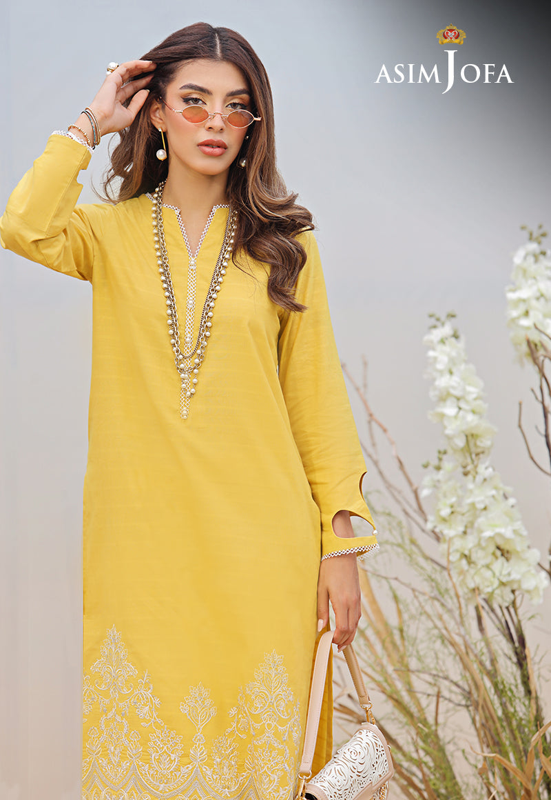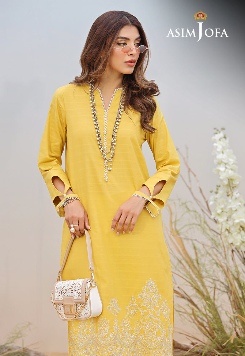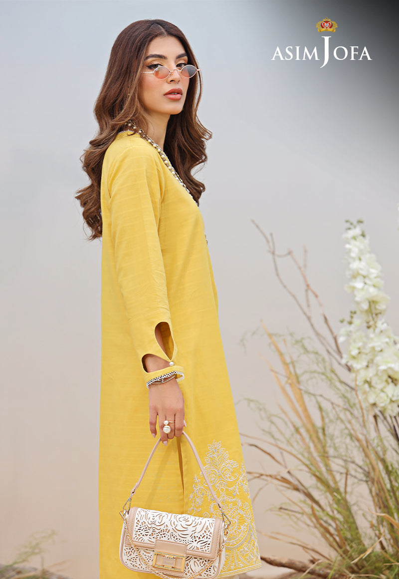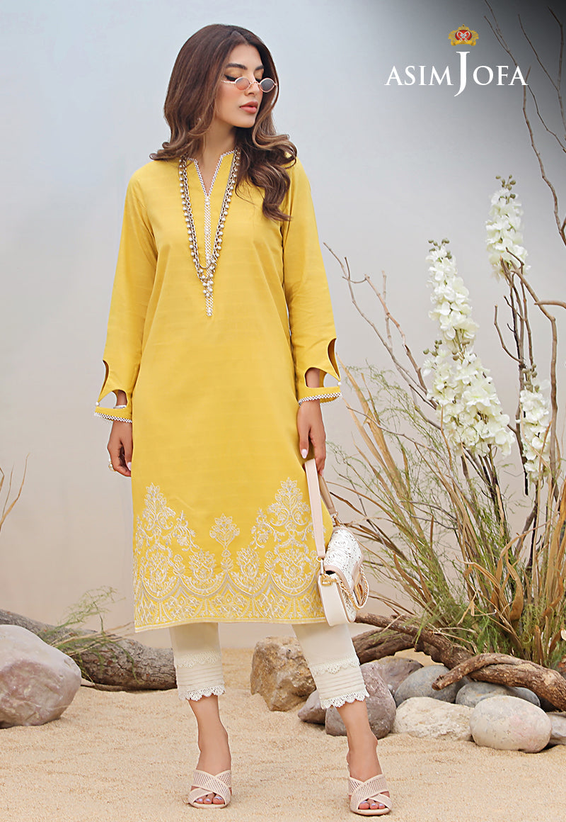 Sunny yellow self-jacquard straight cut shirt spiced up with heavy embroidered borders and cut-out detail on sleeves adding a unique touch.