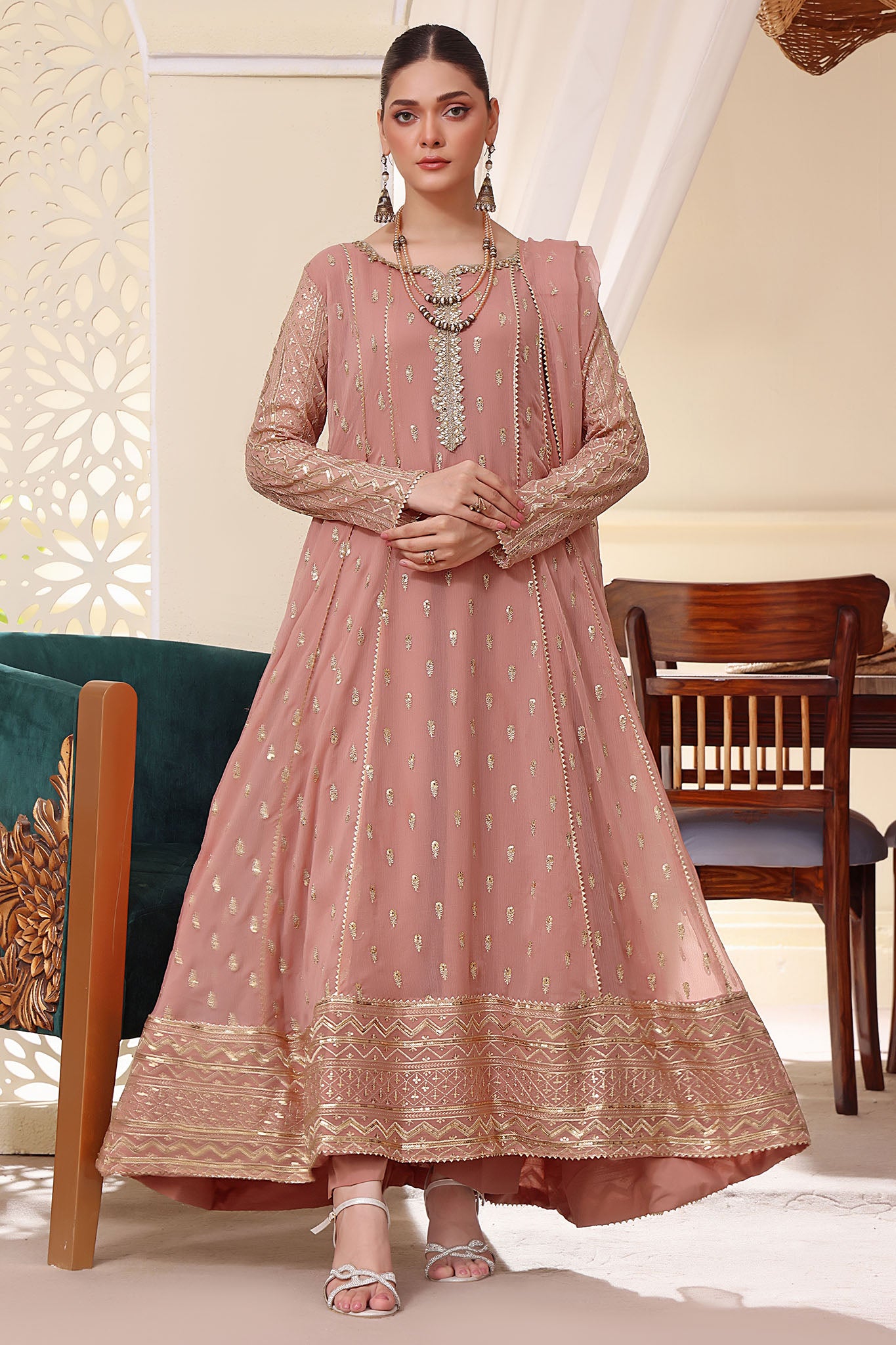 • The chiffon fabric and embroidery work together to create a truly show-stopping piece that exudes elegance