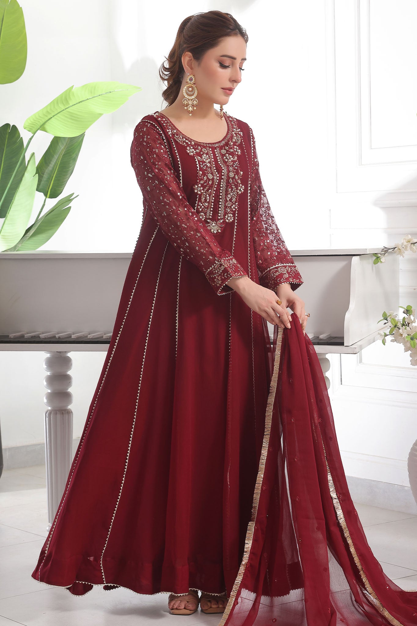 • This elegant long chiffon frock is designed for a graceful and sophisticated look. Made from lightweight embroidered chiffon