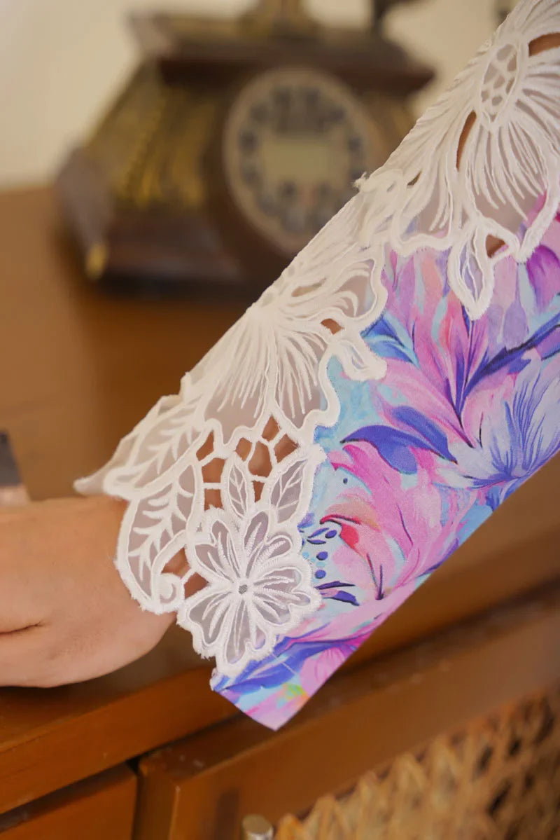 • Shirt: Floral printed long shirt in soft pastel tones, featuring a delicately designed neckline embellished with pearls, along with patched borders and sleeves for an added touch of finesse