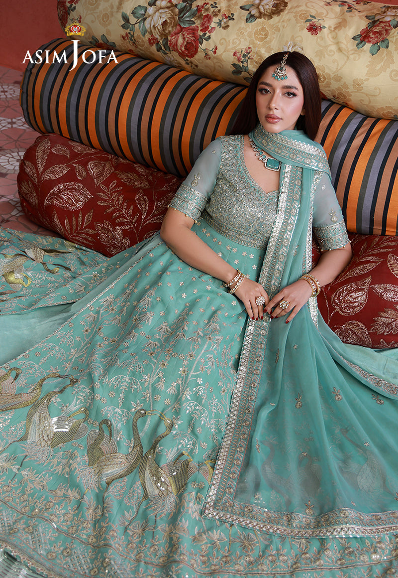 A serene immersion into a tranquil lakeside, where the air is cool and the beauty is effortless. This light blue kalidaar is a poetic tribute to nature, featuring antique gold zari and beige threadwork inspired by the elegant grace of flamingos and lakeside flora. The embroidery is a delicate dance of light gold sequins that sparkle like ripples on water. Paired with an embroidered zari chiffon dupatta that floats like a cloud, this ensemble is the pinnacle of understated elegance.