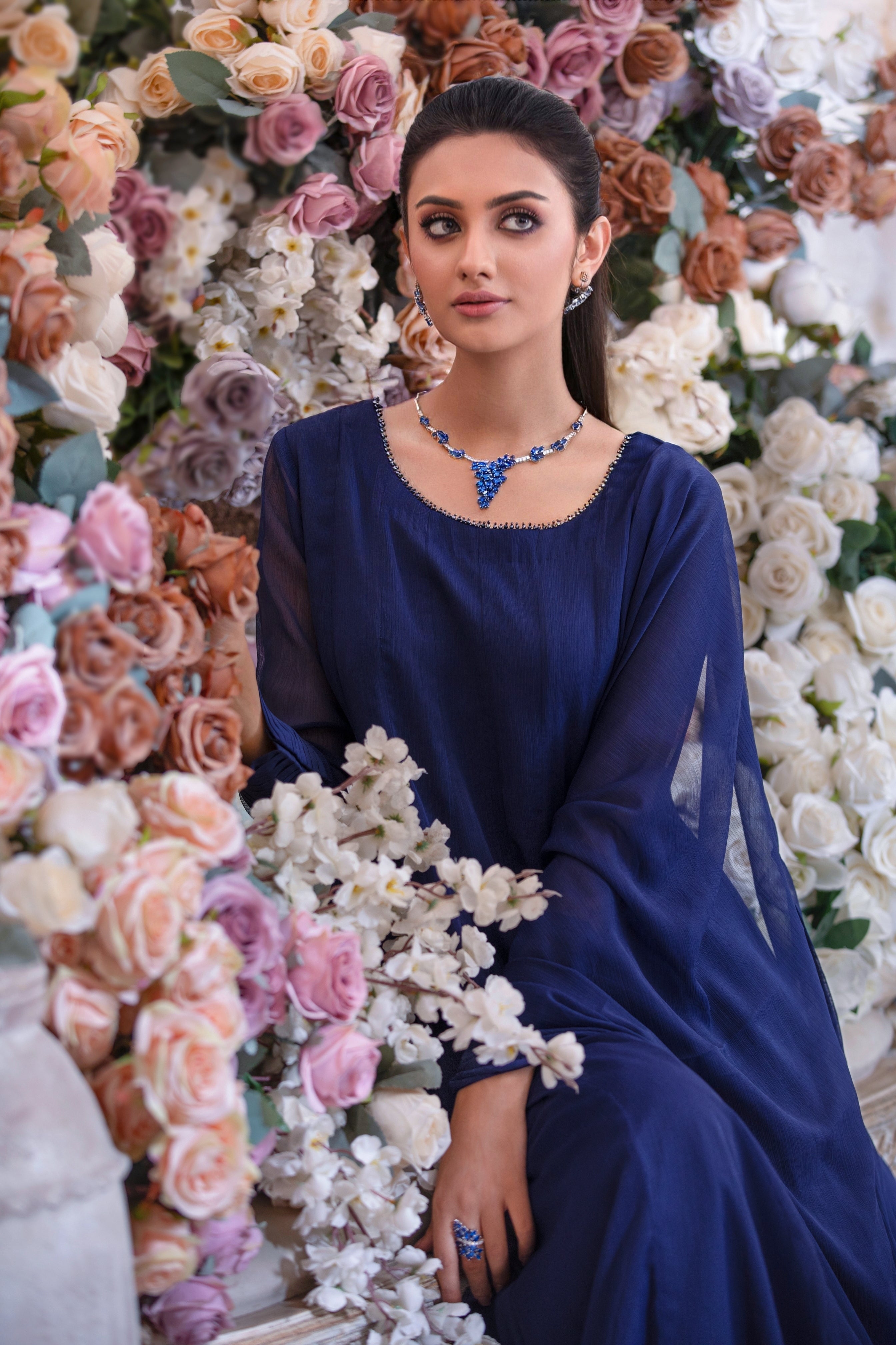 . The Most beautiful (Navy Blue ) Chiffon Kalidaar (Stitched With Inner Attached) Paired With 2.5 Yard Chiffon Dupatta . Fabric Quality And Stitching All Are First Rate.