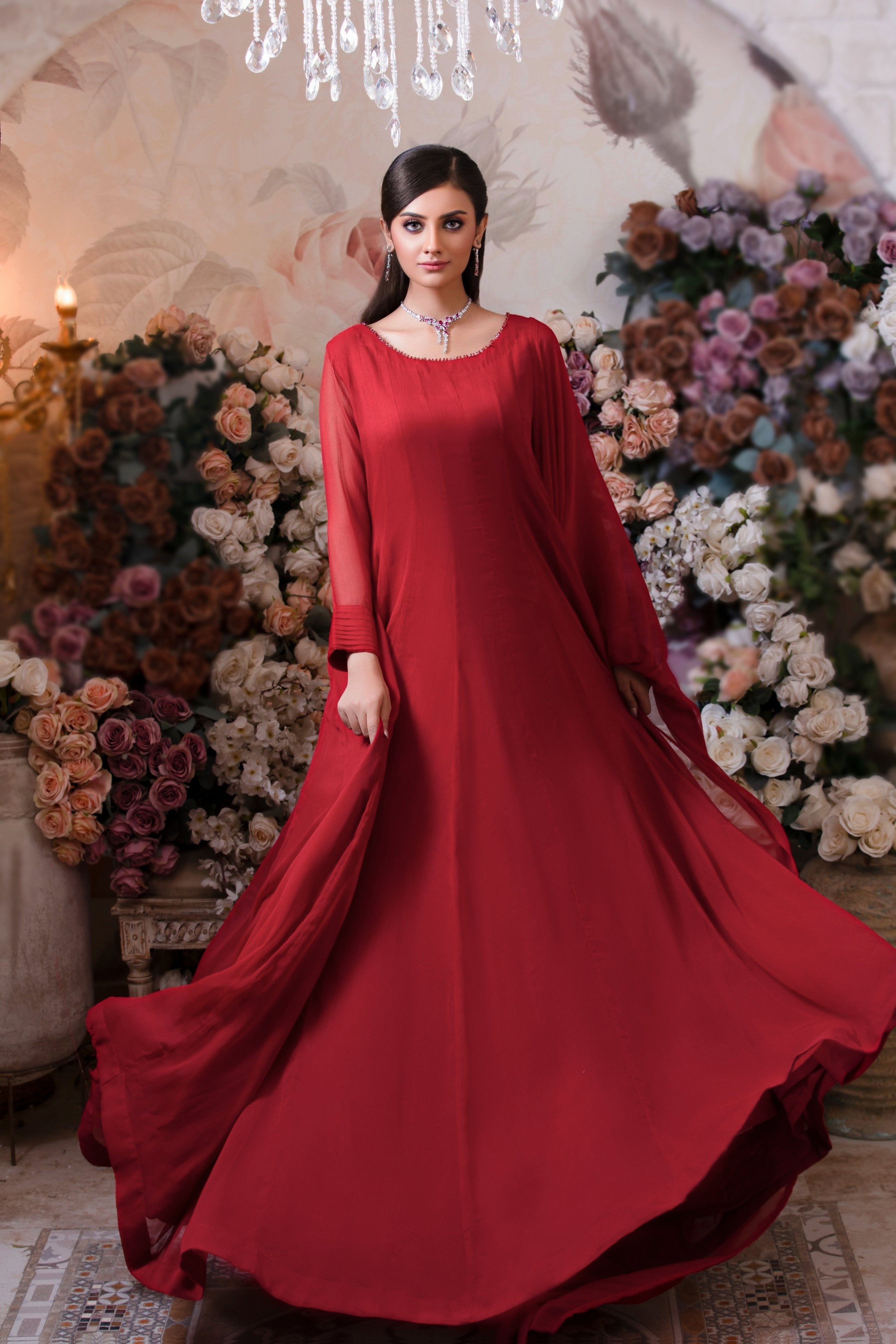 . The Most beautiful Chiffon Kalidaar (Stitched With Inner Attached) Paired With 2.5 Yard Chiffon Dupatta (Four Sided Finished). Embellished With Delicate Crystals On Neck, Fabric Quality And Stitching All Are First Rate.