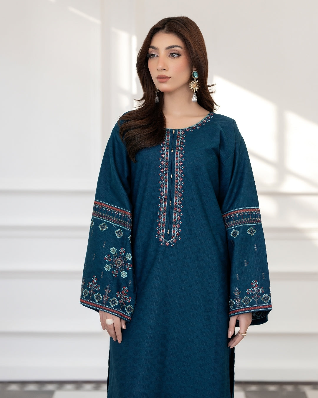 This exquisite Daily/Basic Wear Kurta Set is a winter wardrobe essential. The Straight Cut Kurta in luxurious Cotton Satin features intricate embroidered detailing. Paired with a classic Straight Trouser in comfortable Cotton fabric, this 2-piece set in sleek Black exudes elegance. Elevate your everyday style with this wardrobe staple from Flutterby.