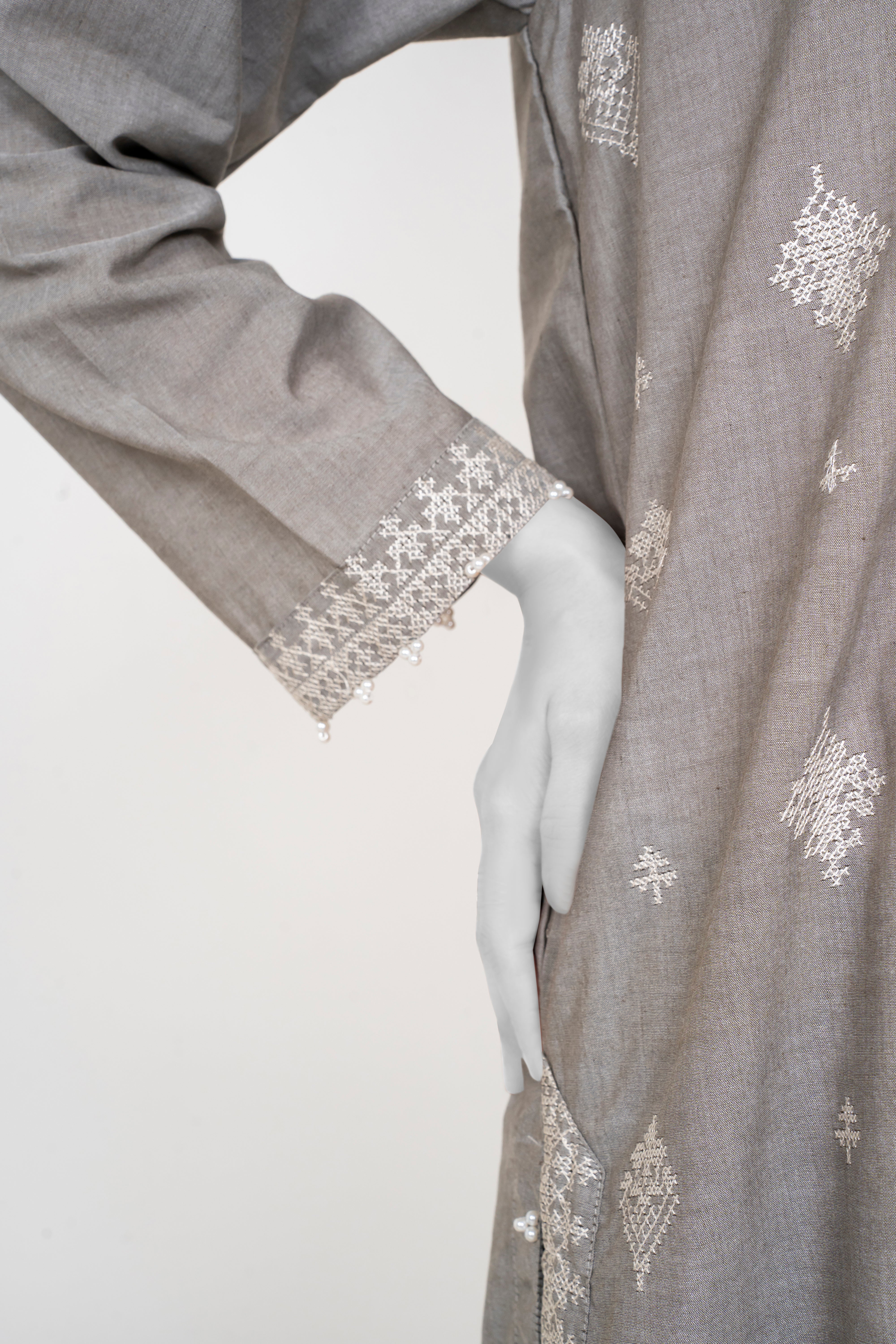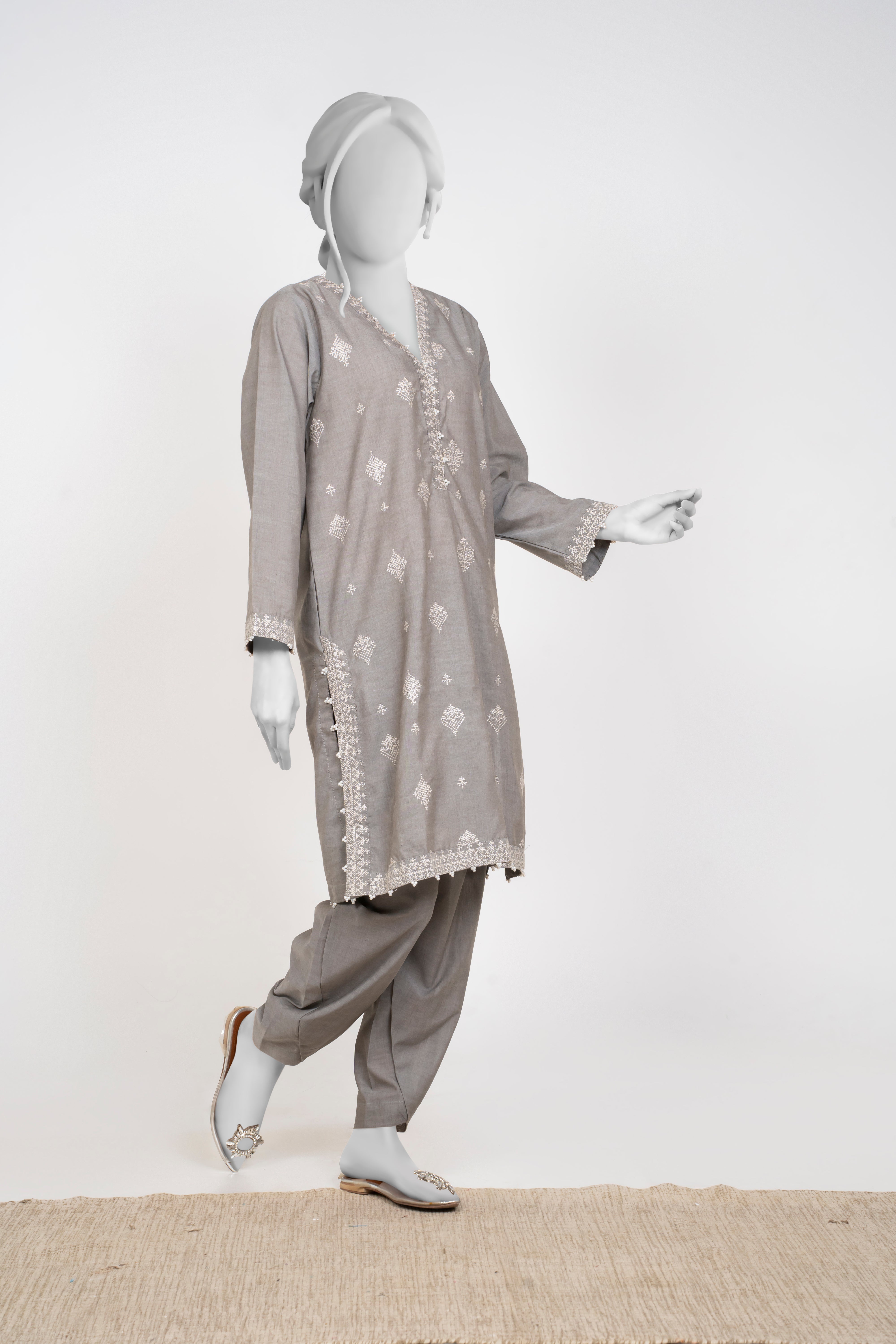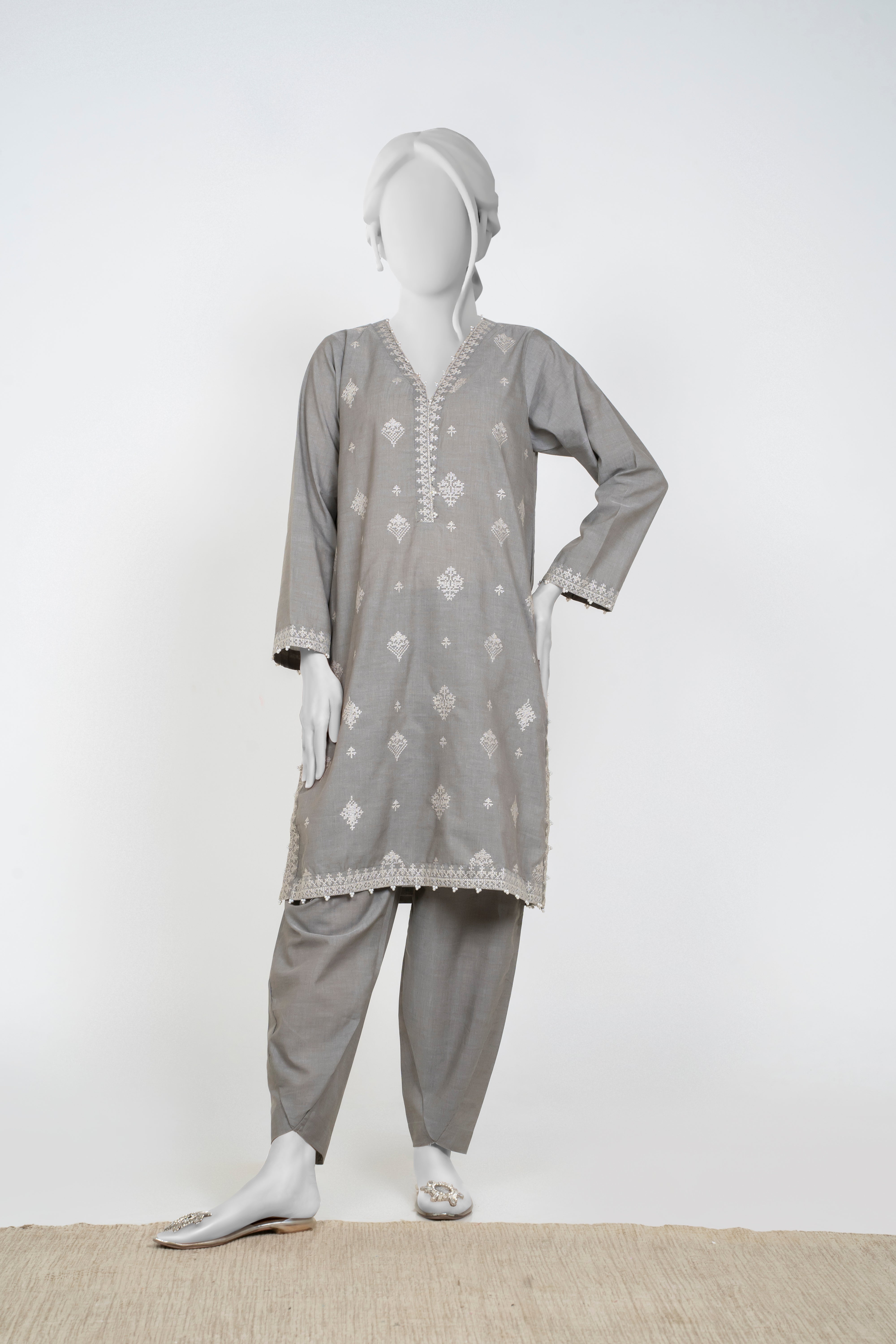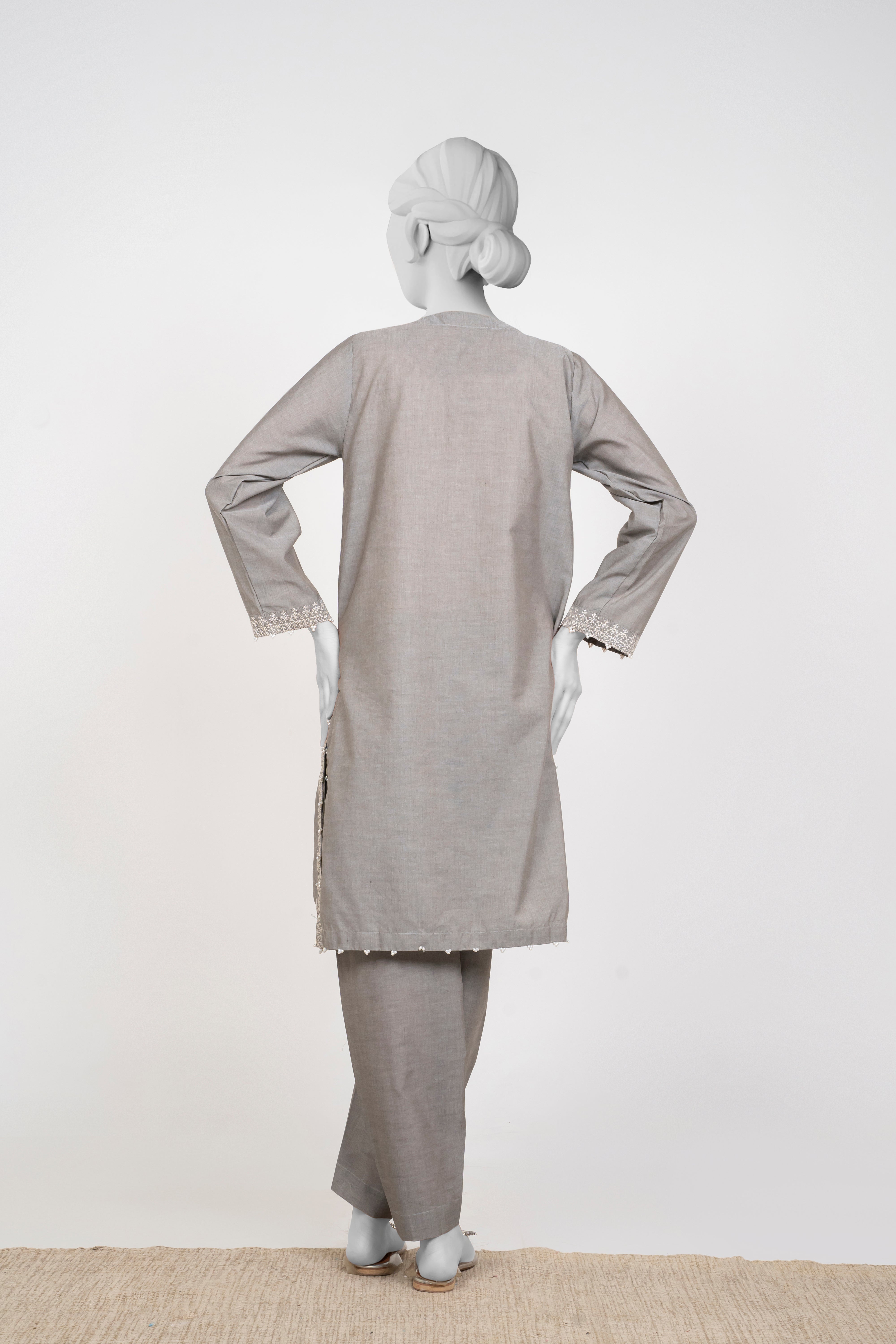 Embrace the Chambray Winters 2025 collection with this elegant Silver Grey 2-piece set featuring solid embroidery that adds refined texture and charm. Paired with tulip-shaped trousers, it offers a fresh and graceful silhouette perfect for stylish winter wear. This ensemble blends comfort and sophistication, making it an ideal choice for those seeking understated elegance with a modern touch.