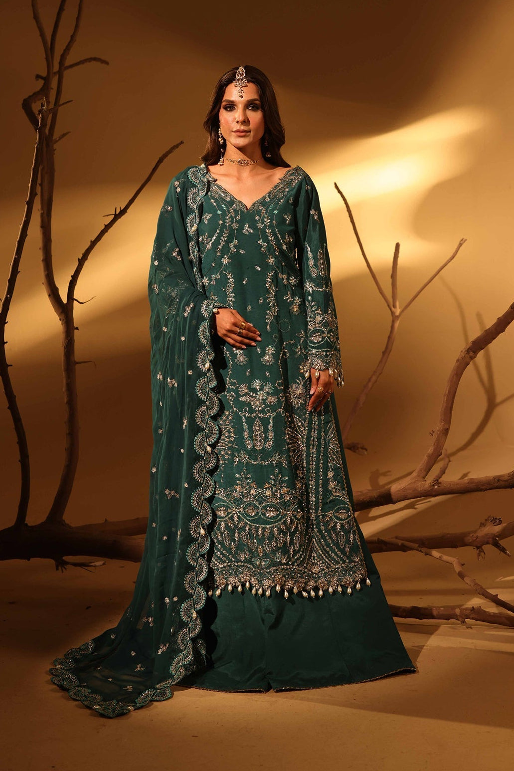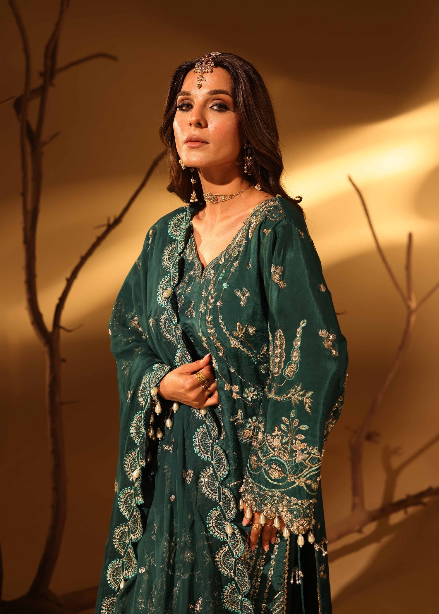 An embroidered chiffon dupatta softens the ensemble with fluid drape, while the dyed raw silk trouser completes the look with effortless polish. Green Slate is crafted for the modern woman who values elegance, confidence, and timeless design.