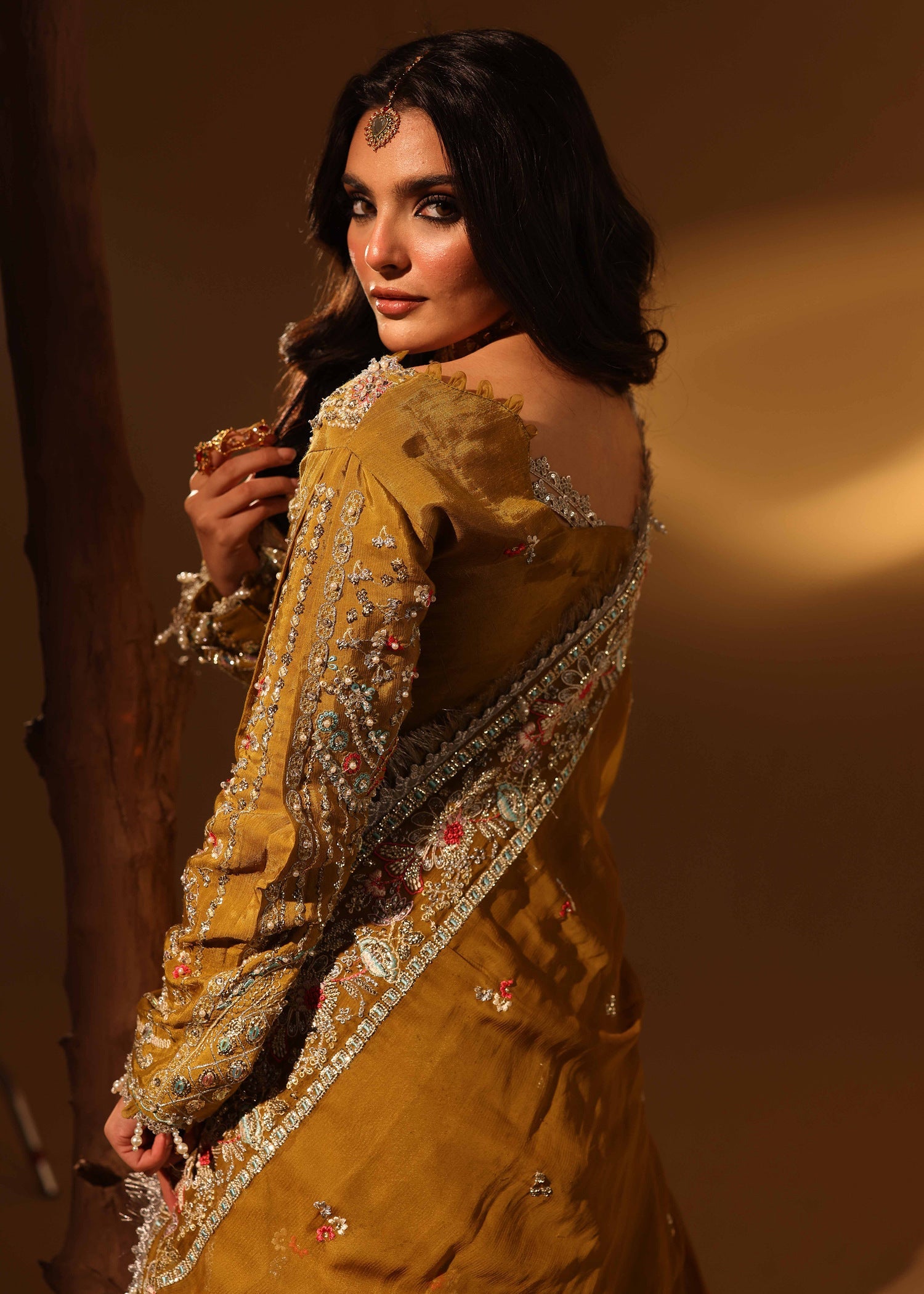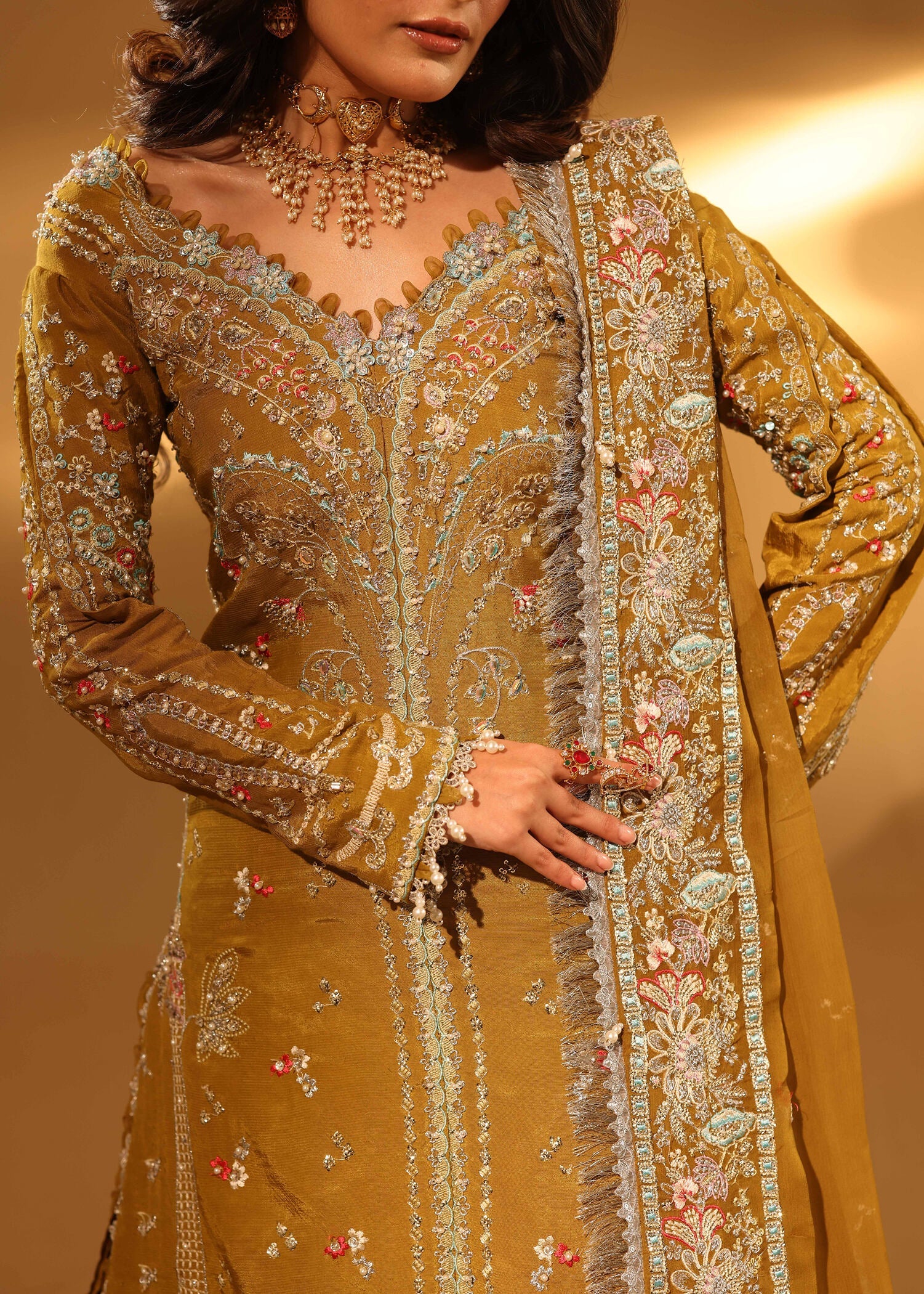 Vibrant and expressive, Mustard Charm celebrates rich color and traditional craftsmanship through a modern lens. Hand-embellished panels, sleeves, and front borders on raw silk create a striking visual narrative, while the embroidered back ensures a polished finish from every angle.