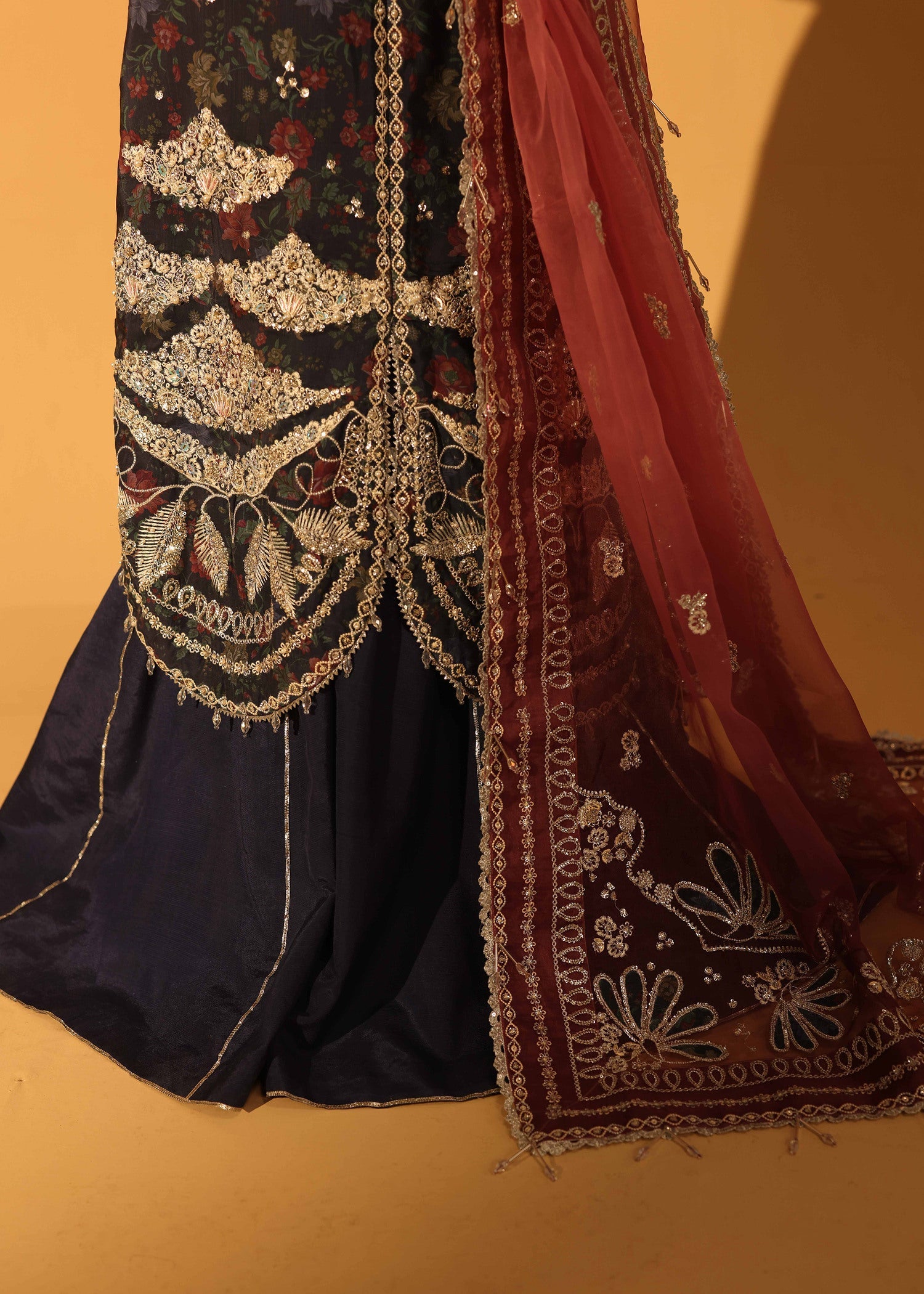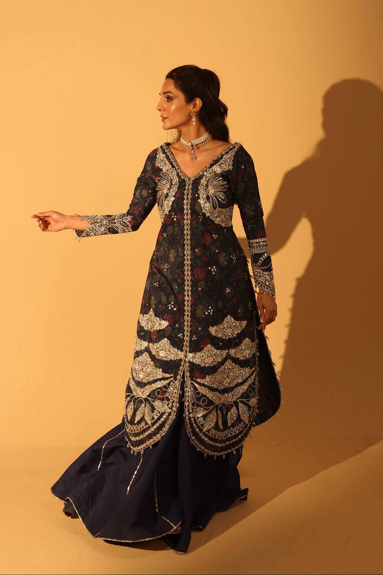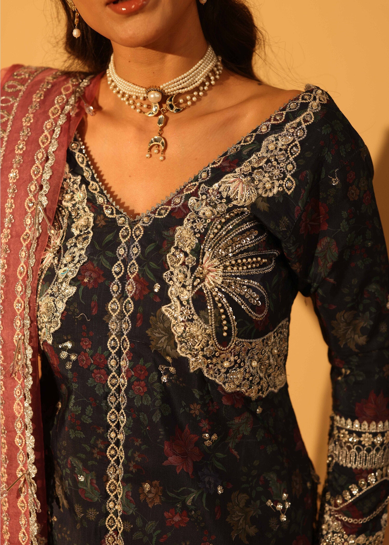 A masterpiece from The Silk Edit, Sapphire Dusk captures the quiet allure of deep black hues with a modern, couture sensibility. Crafted on luxurious printed raw silk, its hand-embellished panels and sleeves create a refined interplay of texture and shimmer. The look is completed with an ethereal embroidered organza dupatta and a sleek raw silk trouser, making Sapphire Dusk an elevated statement of elegance and sophistication.