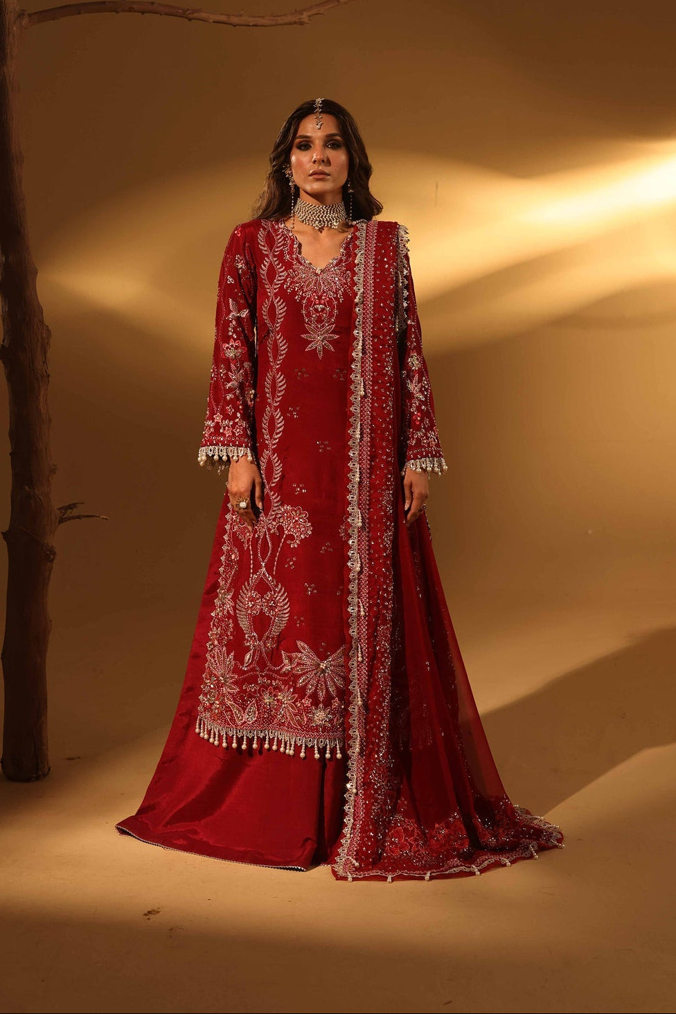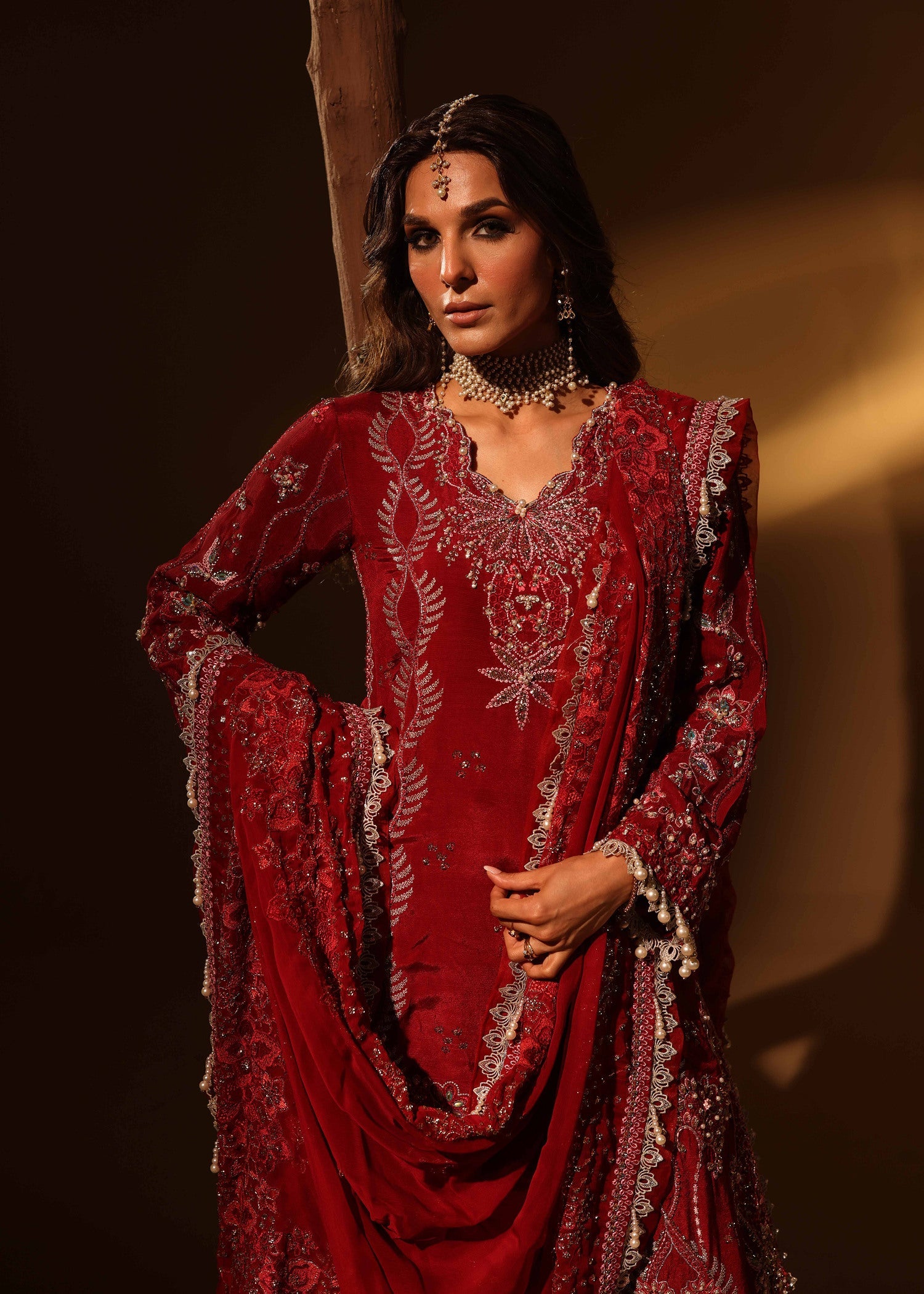 The embroidered chiffon dupatta introduces softness and fluidity, allowing the structured silk base to shine while adding graceful movement. Finished with a sleek dyed raw silk trouser, Velvory is an embodiment of contemporary royalty, powerful, polished, and timeless.
