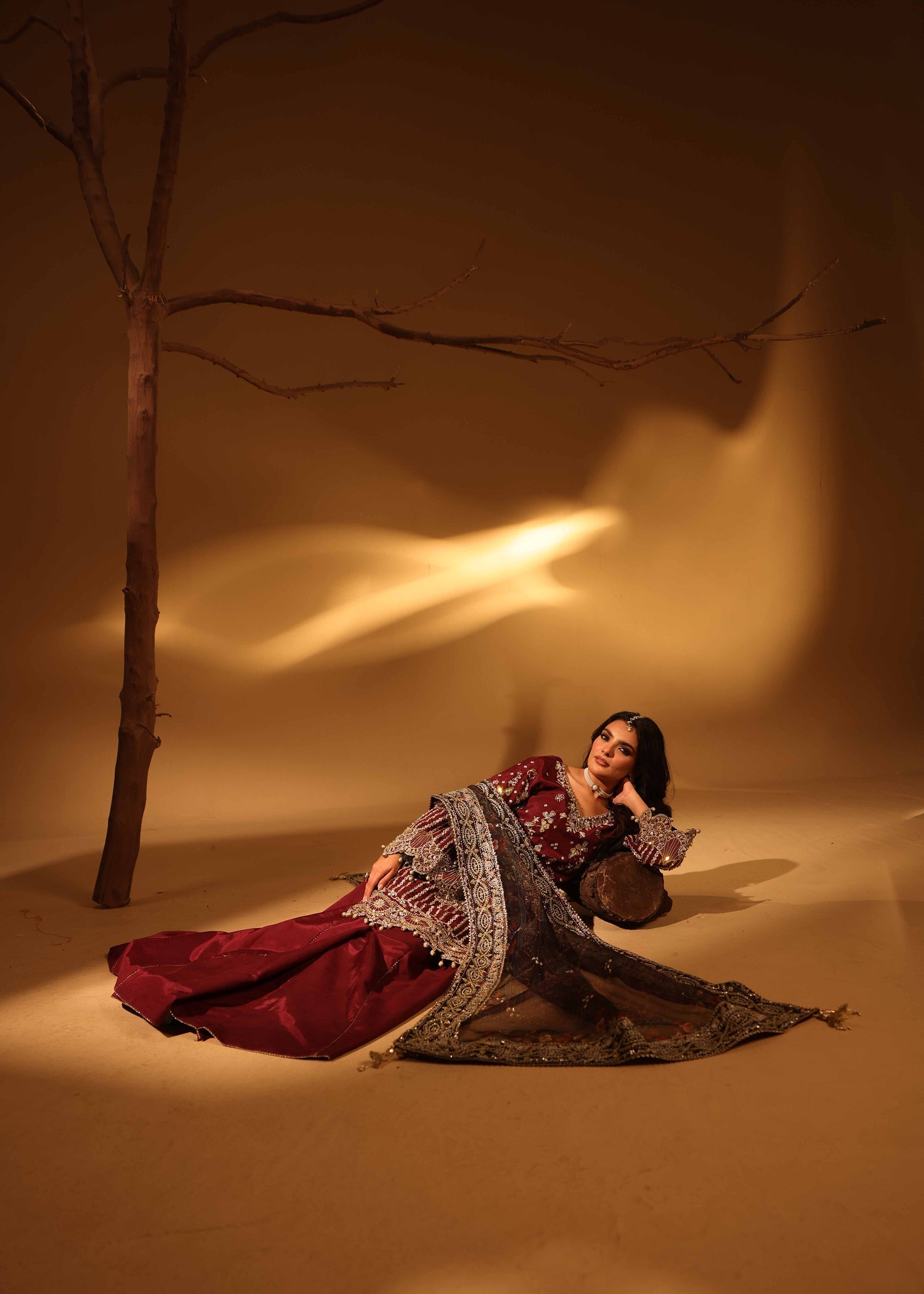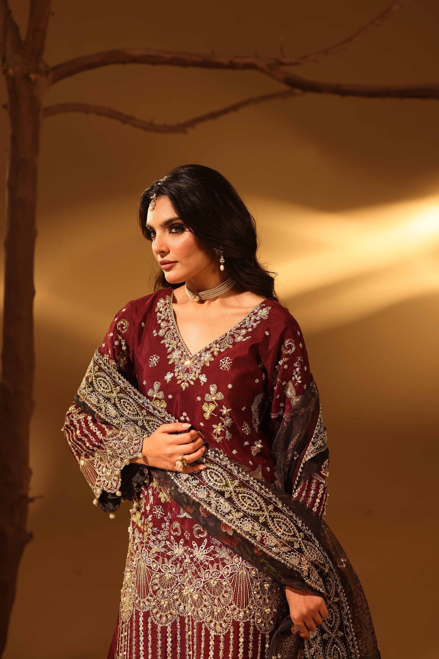 A printed and embroidered organza dupatta, framed with an ornate foreside border, adds dimension and movement. Finished with a dyed trouser, Violet Bloom is a graceful choice for elevated festive and formal occasions.