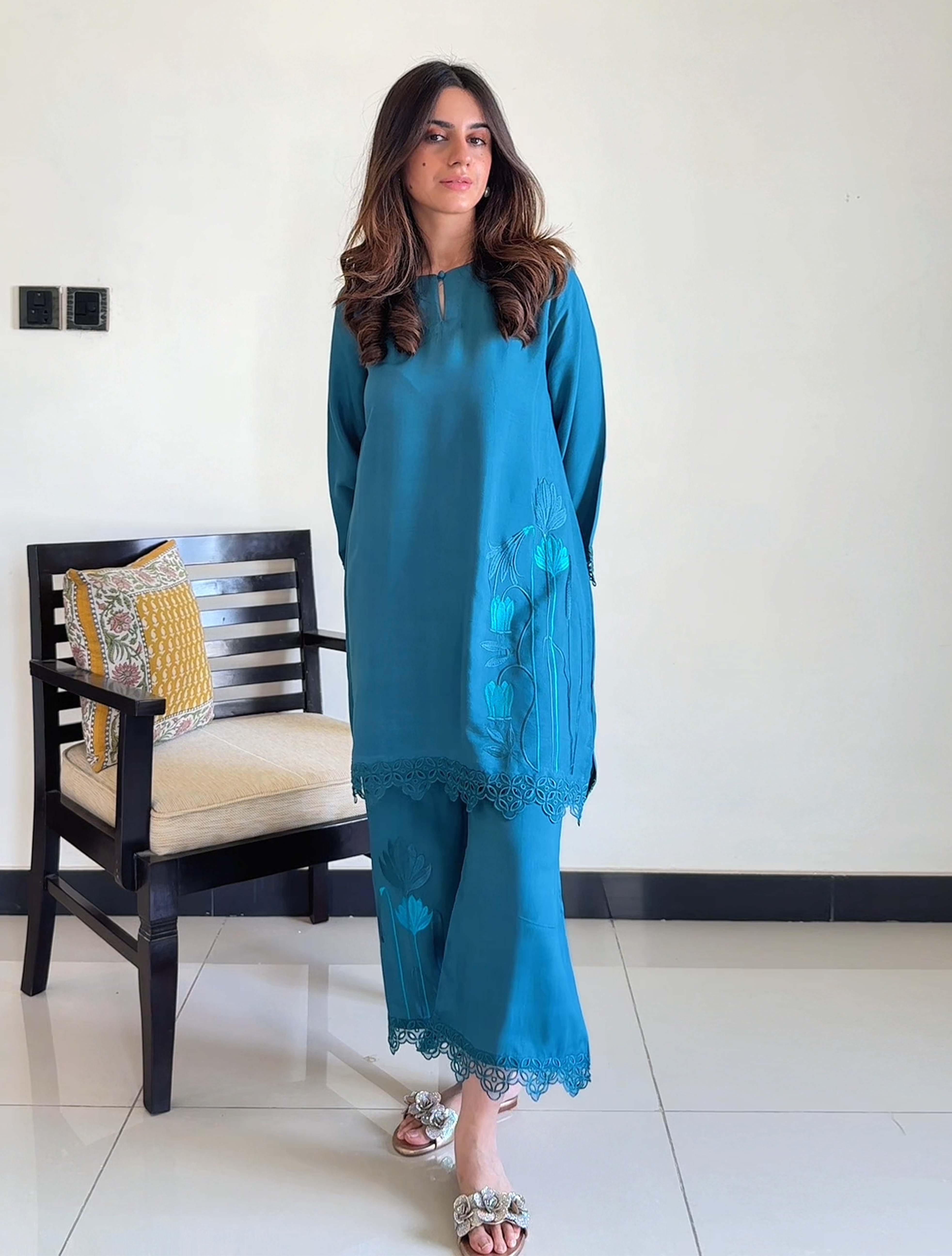 Refined and graceful, this 2-piece teal ensemble in premium silk lawn is a perfect blend of tradition and contemporary charm.