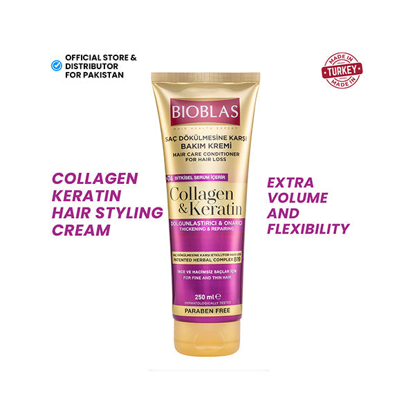 Bioblas Collagen-Keratin Hair Styling Cream is a product that provides extra volume and flexibility to your hair. Thanks to the collagen and keratin it contains, this cream strengthens the hair strands and adds fullness. Additionally, it aims to make the hair look healthier and reduce static.