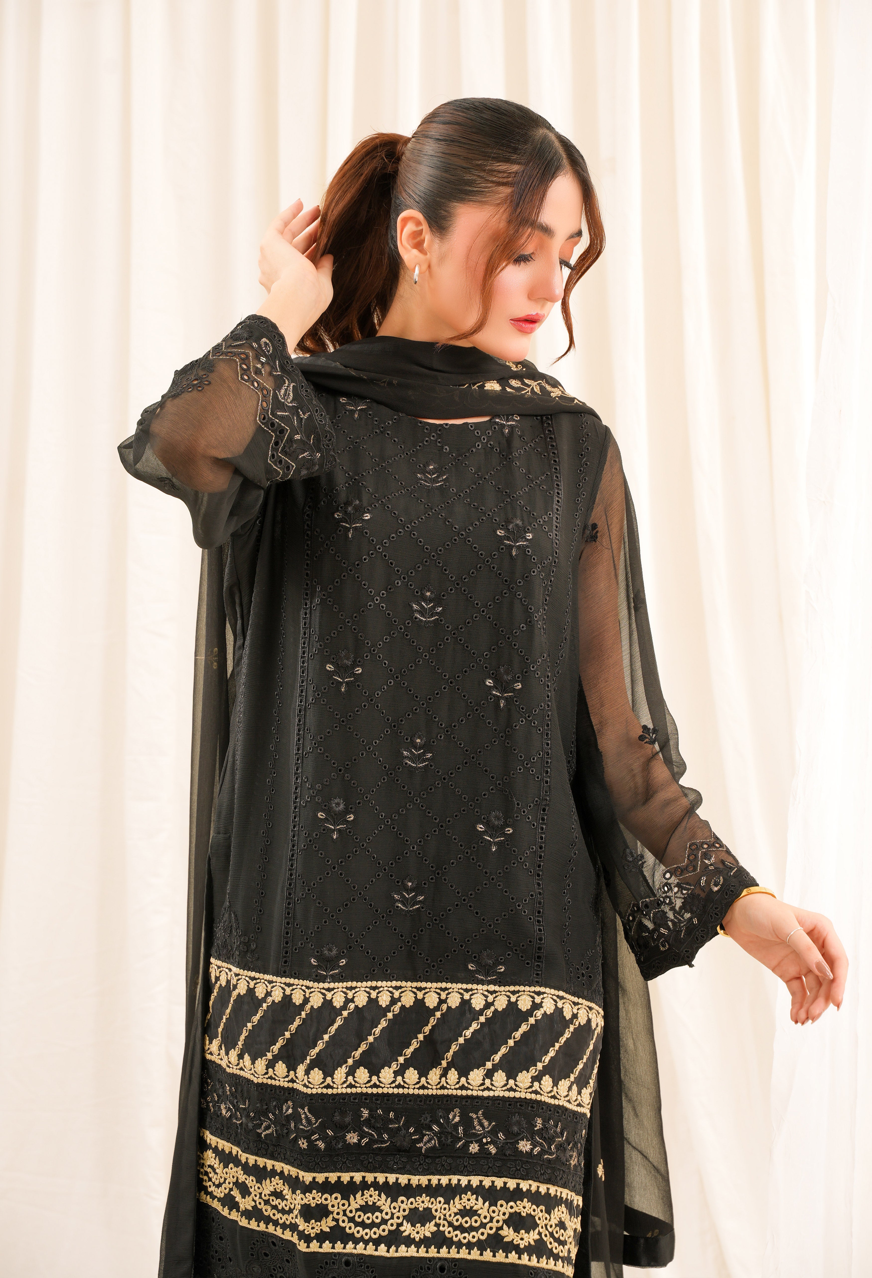 Experience luxury with our Black 3 piece suit made from fine chiffon and intricately embroidered. Elevate your style and stand out in any occasion.