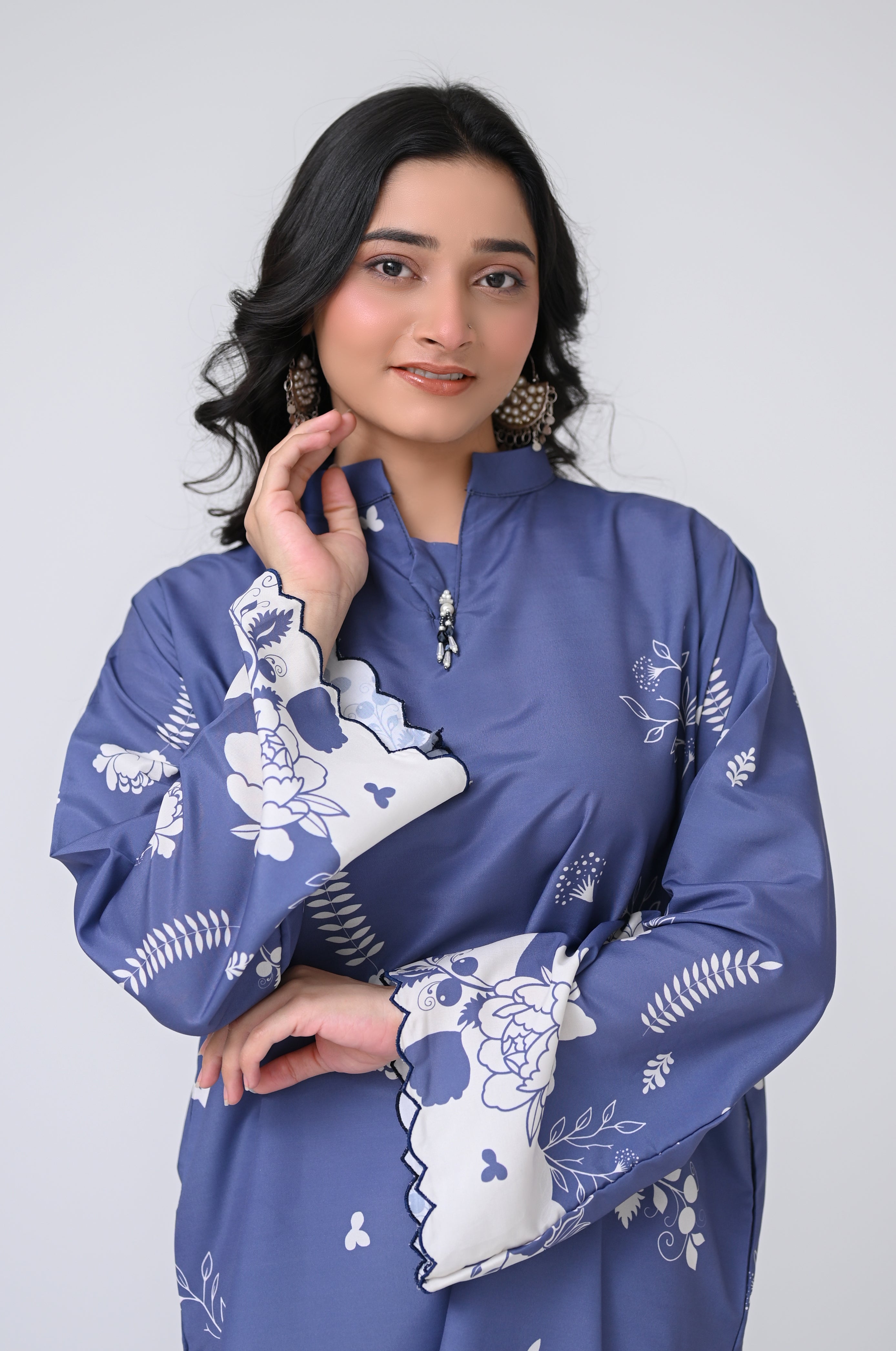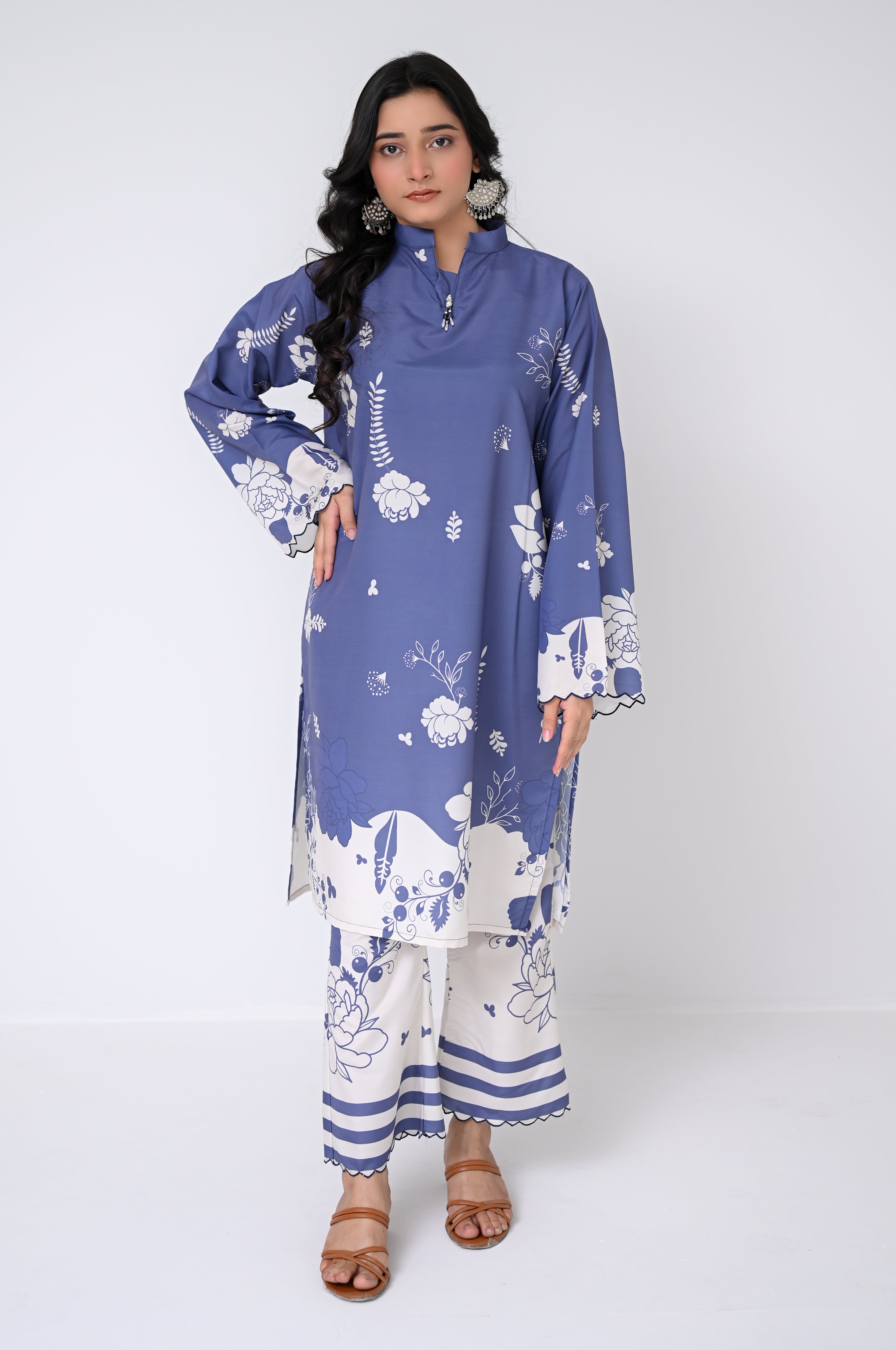 Design Details: The outfit is adorned with soft blue floral detailing that creates a calm and sophisticated look, perfect for the summer season.
