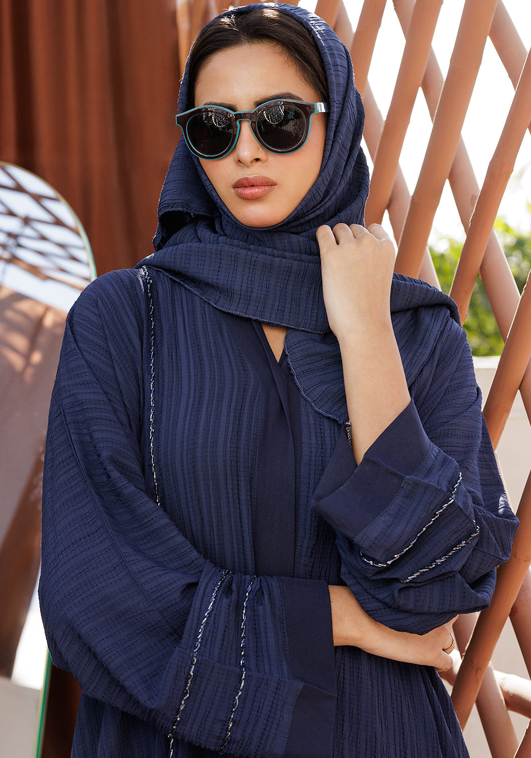 Experience elegance with this navy-blue ensemble, designed with subtle texture and detailed cutdana work on the sleeves. The shimmering embellishments add a refined sparkle, perfect for a sophisticated, modern look. Crafted with care, this outfit seamlessly blends comfort and style for any occasion.
